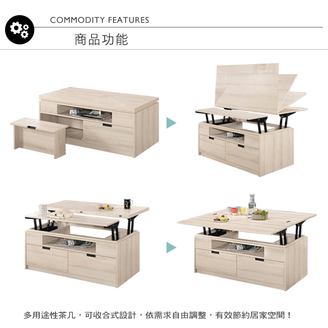 具升降功能、可展開及收合的桌面,多種實用功能,有效節省空間!