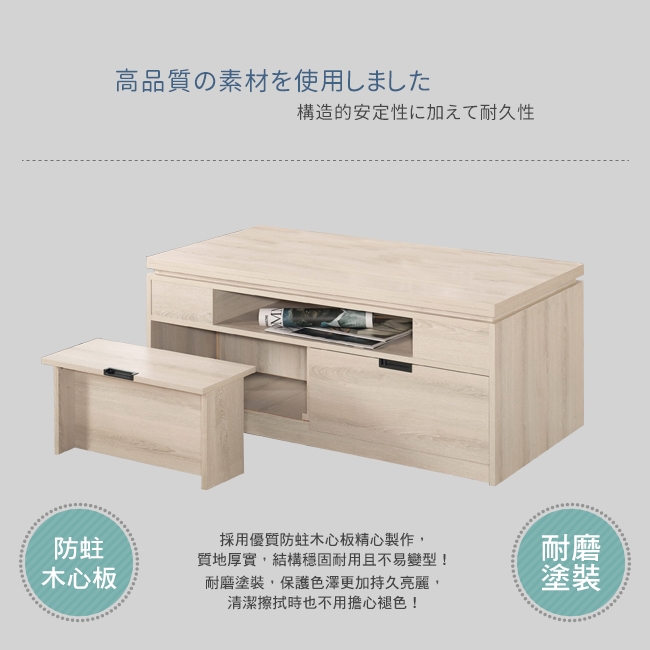 拉合滑順的高級鋼珠滑軌式抽屜及桌面下方的置物層,輕鬆收納,客廳不凌亂!