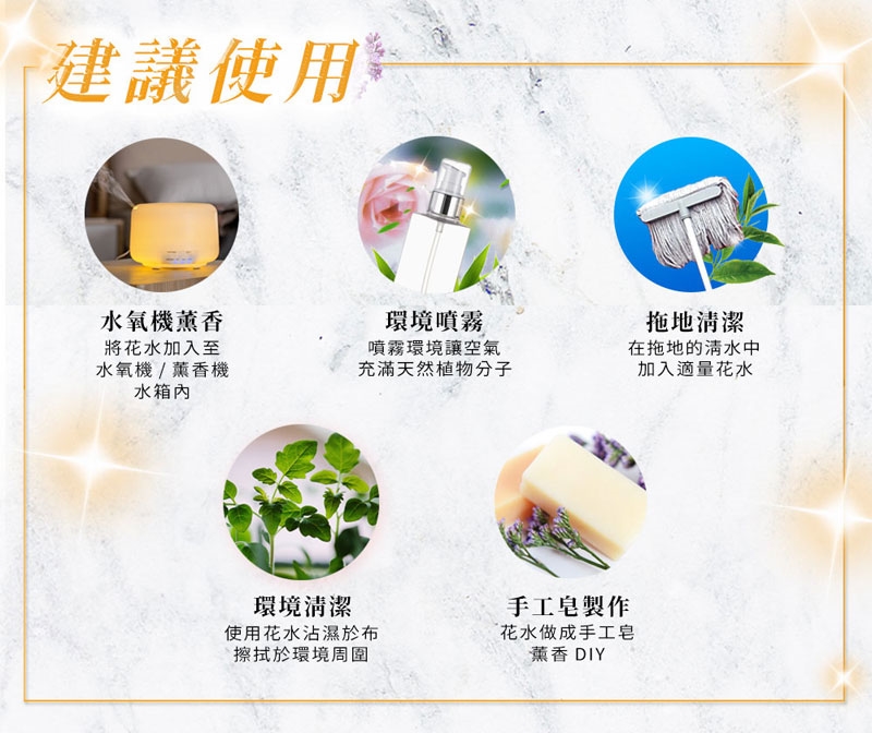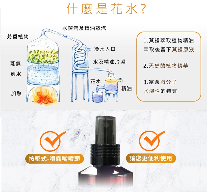 花水一般是指在提煉精油過程中蒸餾所得的冷凝水溶夜,在蒸餾萃取過程中,因密度不同,精油會漂浮在上面,油水分離出來,得到的水分就叫花水(因為科技日新月異,花水不再是副產品,而是專門以提取純露為目的來製作)。因此花水含有微量的精油成份,溫和不刺激,無論您使用在任何香氛水氧機上,都沒問題!