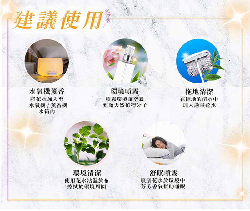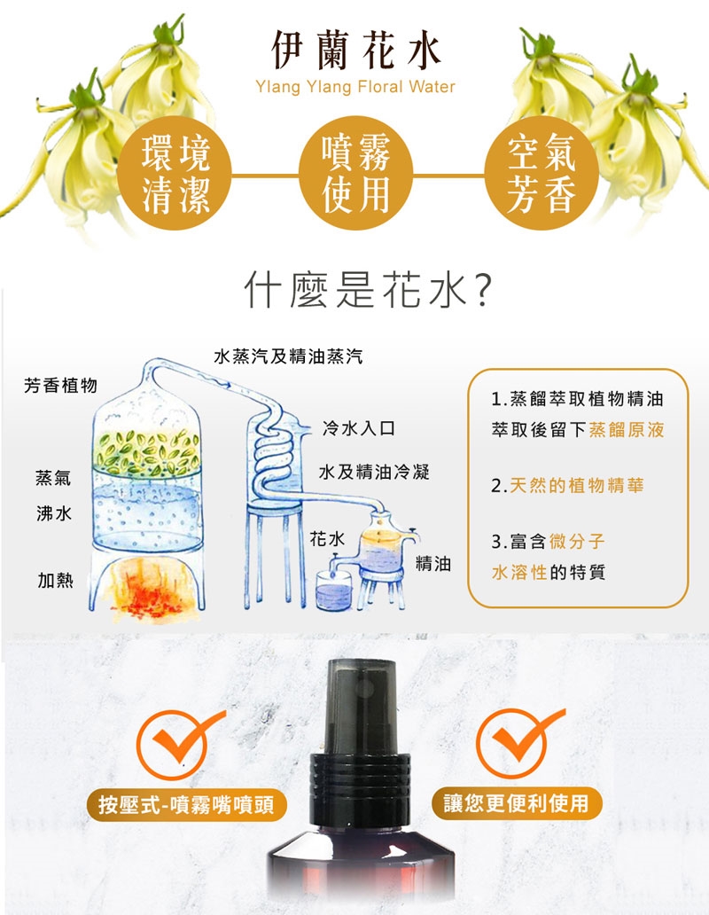 花水一般是指在提煉精油過程中蒸餾所得的冷凝水溶夜,在蒸餾萃取過程中,因密度不同,精油會漂浮在上面,油水分離出來,得到的水分就叫花水(因為科技日新月異,花水不再是副產品,而是專門以提取純露為目的來製作)。因此花水含有微量的精油成份,溫和不刺激,無論您使用在任何香氛水氧機上,都沒問題!