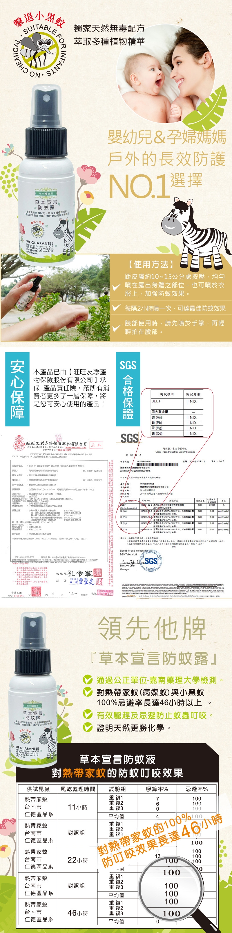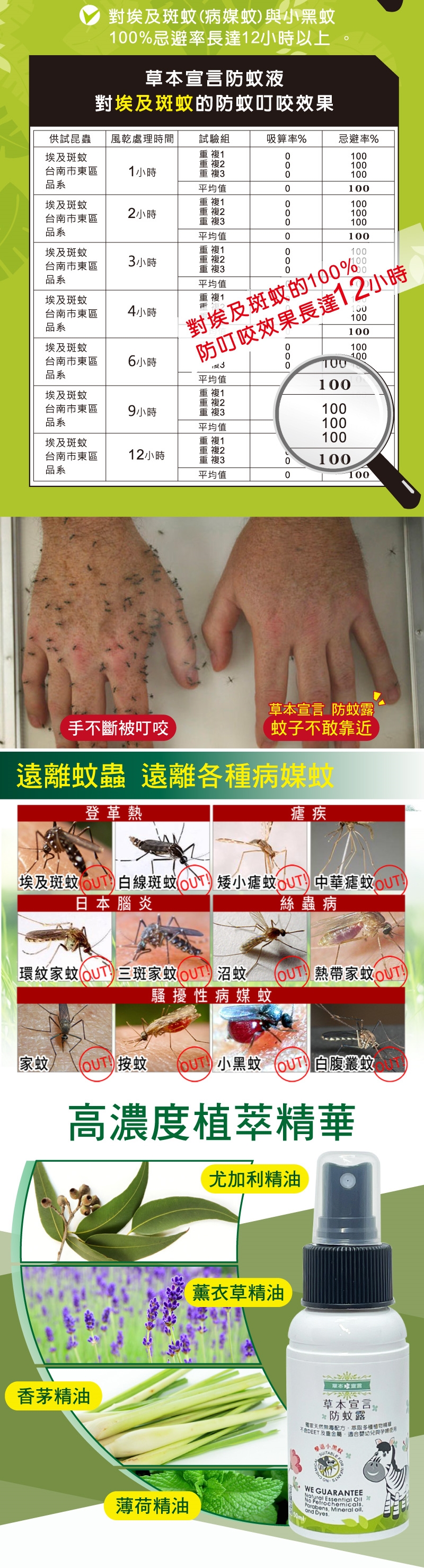 ★專為病媒蚊設計!通過公正單位-嘉南藥理大學檢測,對埃及斑蚊、熱帶家蚊(病媒蚊)與小黑蚊,100%忌避率長達3小時以上,能有效驅趕及忌避防止蚊蟲叮咬,證明天然更勝化學。
