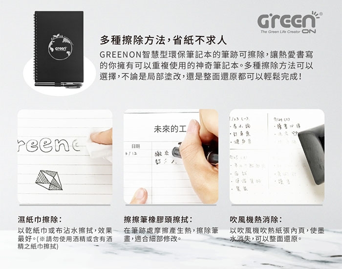 GREENON 智慧型環保筆記本的筆跡可擦除,讓熱愛書寫的你擁有可以重複使用的神奇筆記本。多種擦除方法可以選擇,不論是局部塗改,還是整面還原都可以輕鬆完成!