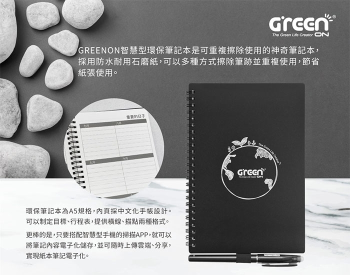 GREENON 智慧型環保筆記本採用防水耐用石磨紙,可以多種方式擦除筆跡並重複使用,節省紙張使用。環保筆記本為A5規格,內頁採中文化手帳設計,可以制定目標、行程表,提供橫線、描點兩種格式。更棒的是,只要搭配智慧型手機的掃描APP,就可以將筆記內容電子化儲存,並可隨時上傳雲端、分享,實現紙本筆記電子化。