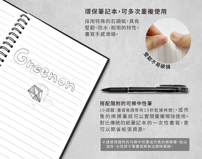 GREENON 智慧型環保筆記本採用特殊的石頭紙,具有堅韌、防水、耐用的特性,書寫手感滑順。搭配隨附的可擦中性筆(小提醒:書寫後請等待15秒乾燥時間),或市售的擦擦筆就可以實現重複擦除使用。對比傳統的紙筆記本的一次性書寫,更可以節省紙張資源。