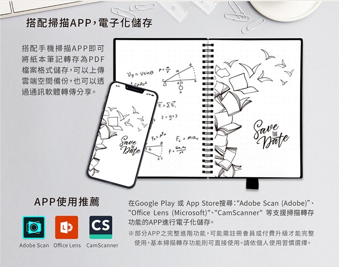 每一字、每一句、每一頁的筆記都是很重要的,在擦除筆記本之前,就讓智慧科技來幫忙電子化儲存吧!搭配手機掃描APP即可將紙本筆記轉存為PDF檔案格式儲存,可以上傳雲端空間備份,也可以透過通訊軟體轉傳分享。