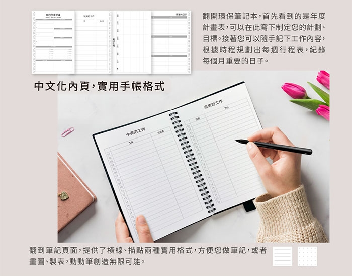 翻開環保筆記本,首先看到的是年度計畫表,您可以在此寫下制定您的計劃、目標。接。著您可以隨手記下工作內容,根據時程規劃出每週行程表,紀錄每個月重要的日子,更可以利用這些頁面追蹤例行事項,例如您的課程、工作安排等等。