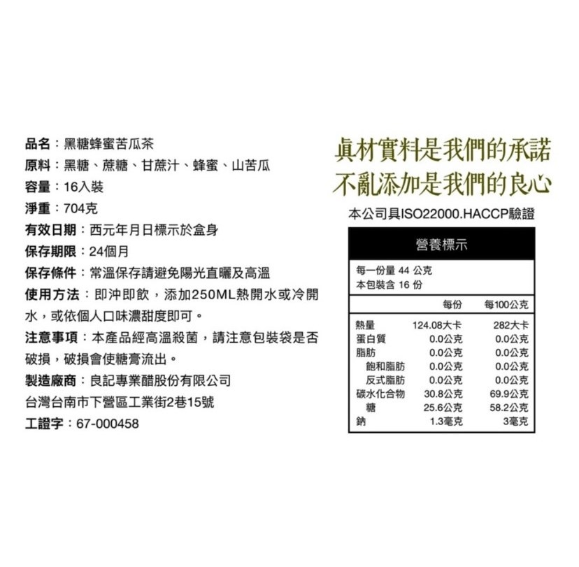 成分:黑糖、蔗糖、甘蔗汁、蜂蜜、山苦瓜