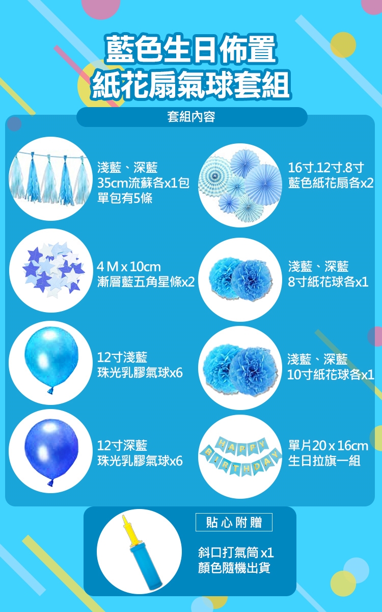 商品品名:藍色生日佈置紙花扇氣球套組