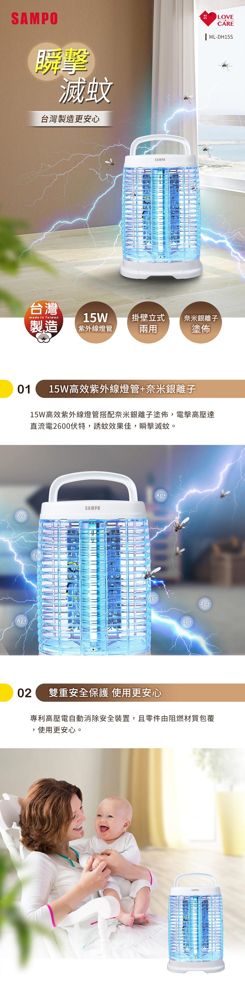 ◆15W高效紫外線燈管搭配奈米銀離子塗佈,誘蚊效果更佳。