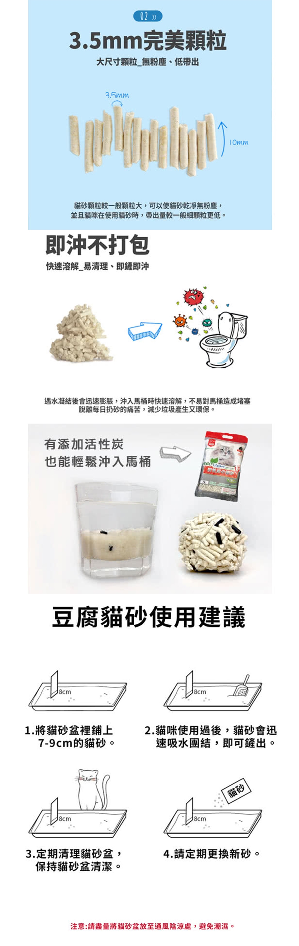 l 豆腐砂吸水力、吸濕力強,未使用的貓砂請確實密封於陰涼處