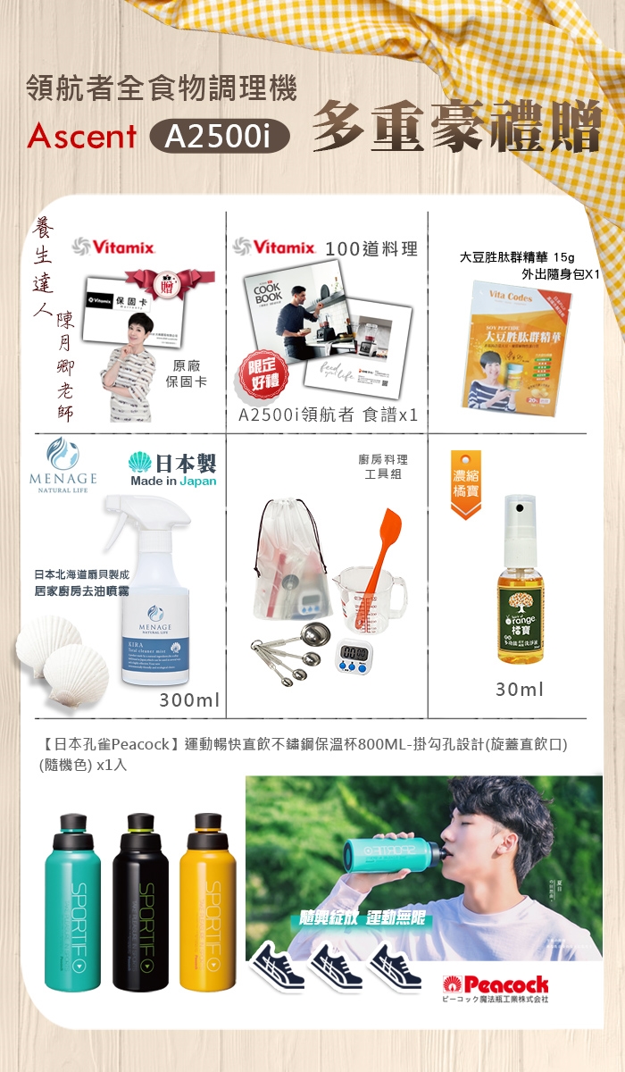 A2500i能自動感應容杯尺寸,自主偵測不同的容杯所需要的調理時間,並透過無線連接鎖定杯蓋,當容杯未鎖緊時,無法運轉。調理中途開啟杯蓋,調理機自動停止,調理更放心。