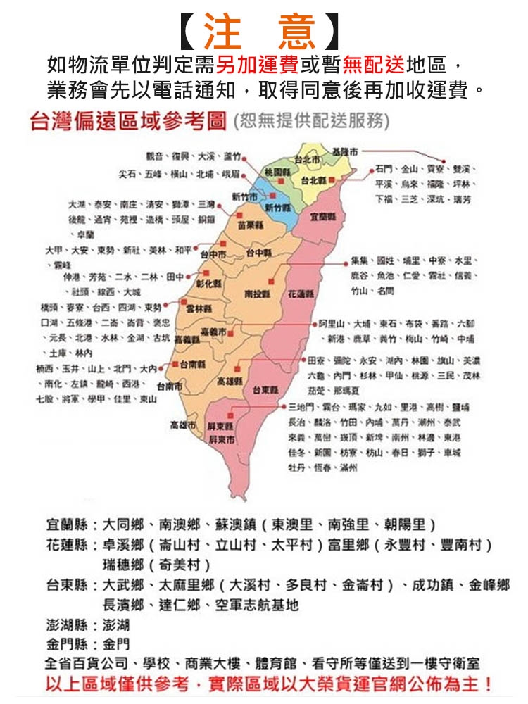 🚚如物流單位判定需另加運費(偏遠山區、鄉鎮)或無法送貨時,業務會先以電話通知,取得同意後再加收運費;本司保有配送與否權利。