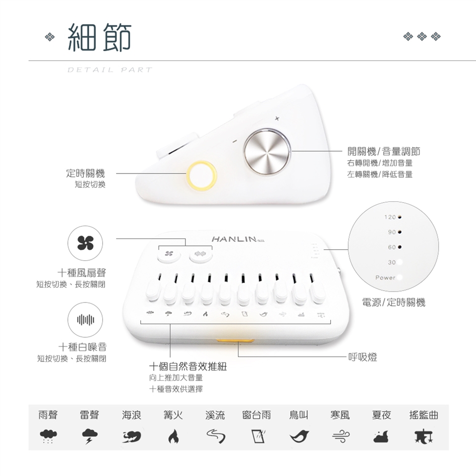 推鈕聲音有10種自然音(雨、雷、海浪、篝火、溪流、窗台雨、森林鳥叫、 寒風、夏夜、搖籃曲)。