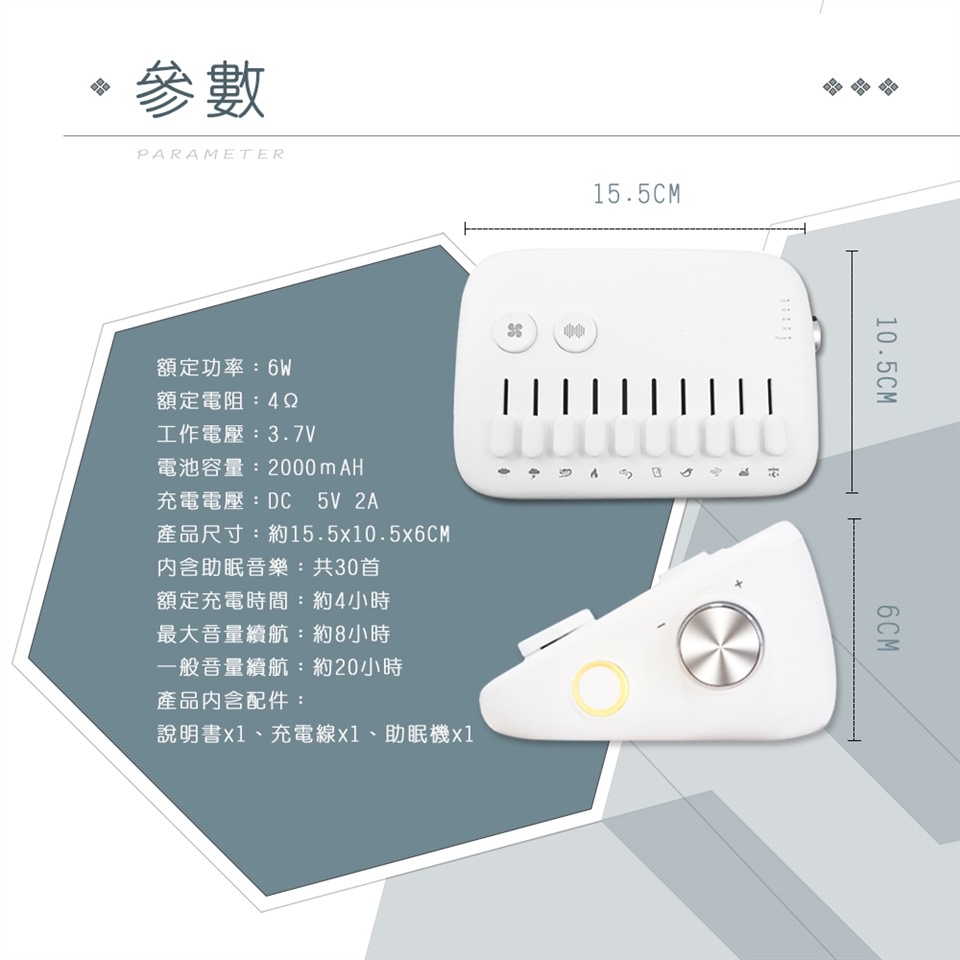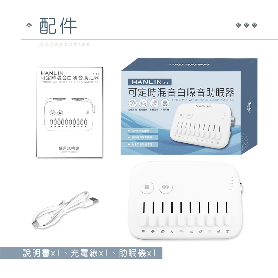產品內含配件:說明書x1、充電線x1、助眠機x1