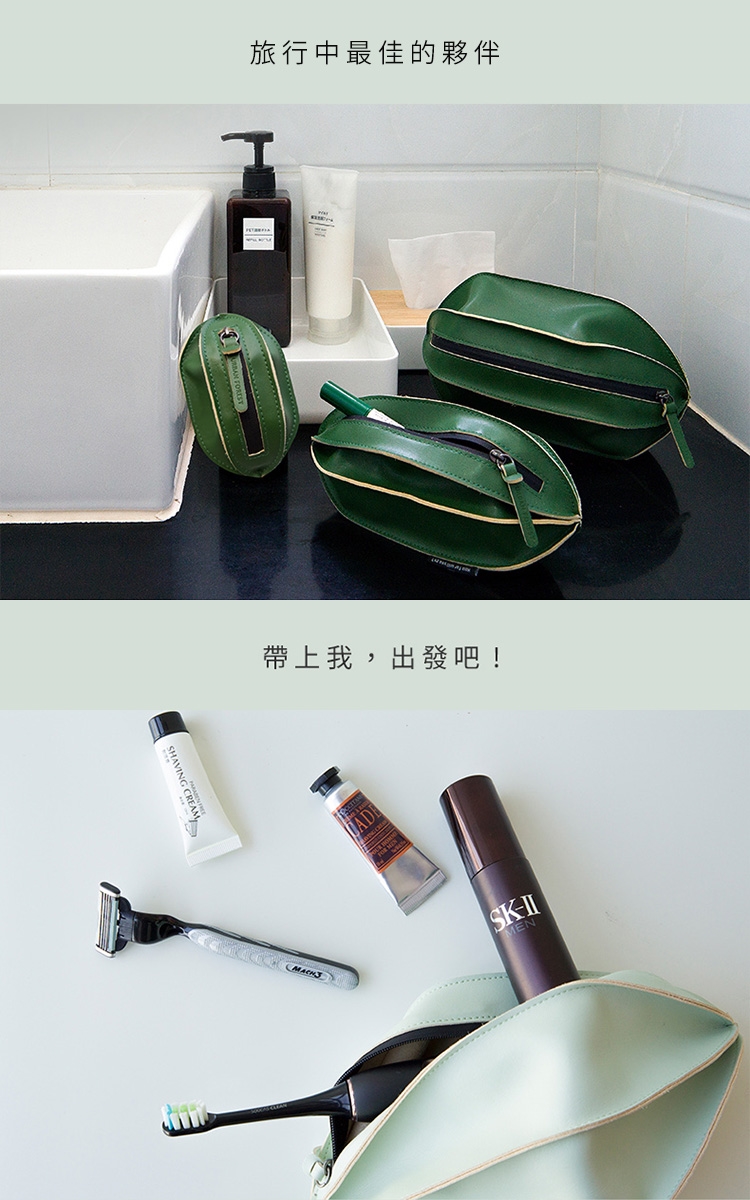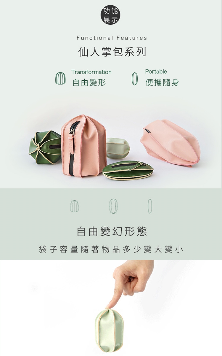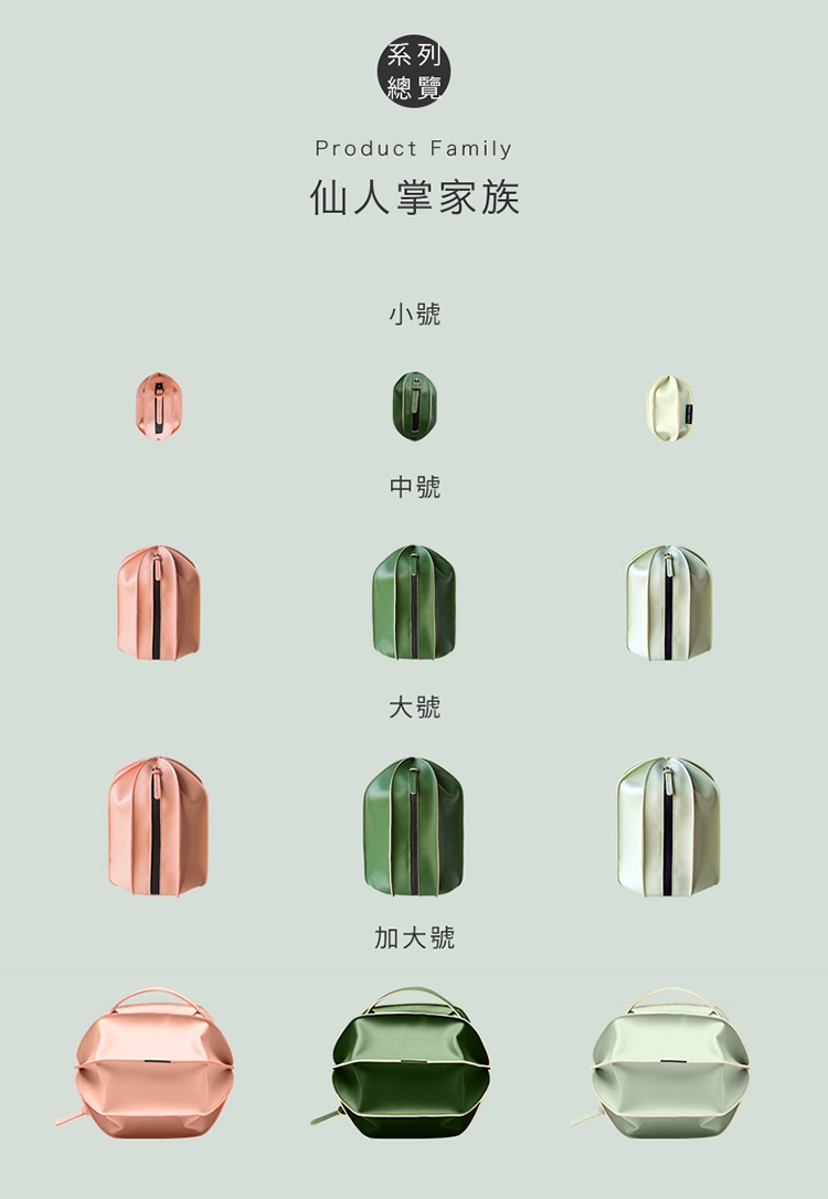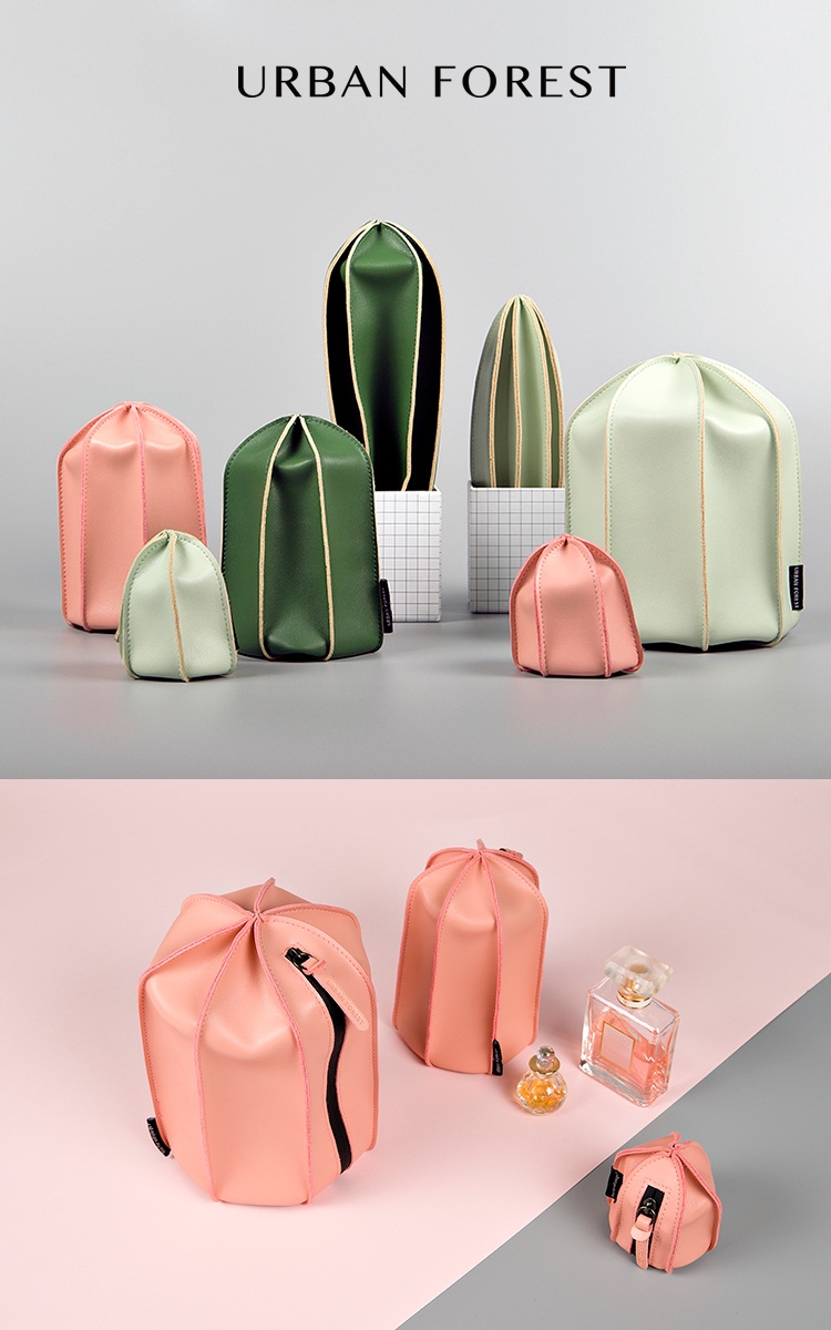 仙人掌洗漱收納包,設計靈感來自仙人掌,讓出遊變得更有趣!任意變形,小身材大容量,隨著收納的物品多少改變容納的形態,可扁可尖可鼓。均勻裁片做工精密,手工收口,超纖材質,柔軟防水,比真皮更耐磨抗髒。大號、中號可裝差旅洗漱用品,小號可做為零錢包,加大號除可容納更多物品,並有提把方便提取。