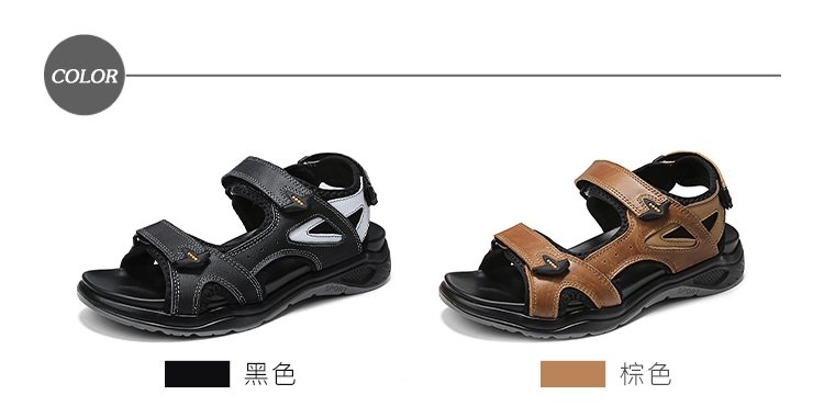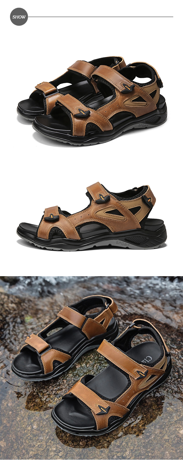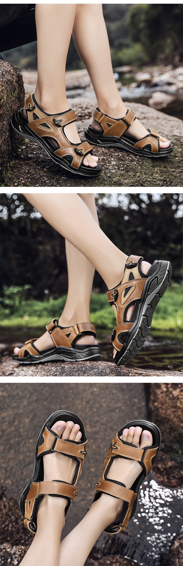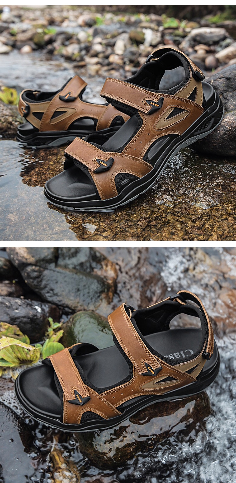 【Ansel】真皮質感牛皮經典魔鬼粘舒適戶外休閒涼鞋 ( 棕 )