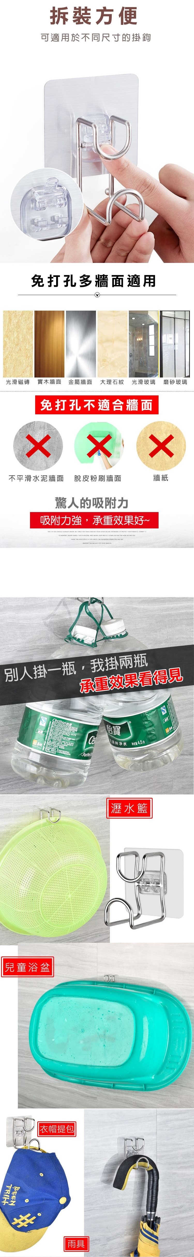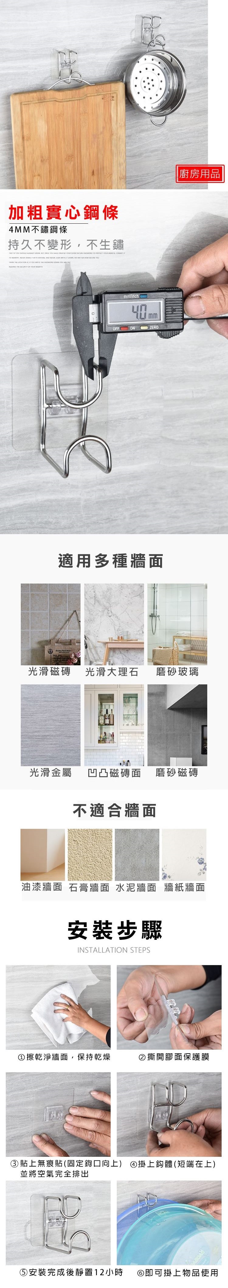 商品詳細介紹 你的瀏覽器不支援 video 標籤 使用方法說明 1.將牆面清潔並擦乾2.撕開膠面保護膜3.貼上無痕貼(固定鉤口向上)並將空氣排出4.掛上掛勾5.安裝完成靜待12小時6.掛上物品 注意事項 不適用於油漆、石膏、水泥與牆紙牆面
