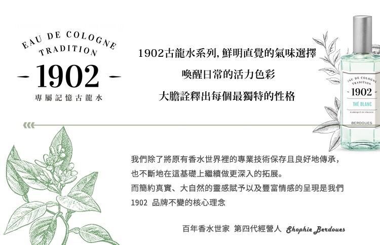 百年來憑藉其獨特技術以及專業經驗,致力於現代香水的設計與調配,專業調香技術結合了與大自然共存的有機理念,打造一個豐富專屬的香氛王國,創造出每一款蘊含獨特情感的藝術品,踏上最真實純粹的嗅覺旅程。隨著百年世代的交替,Berdoues家族第四代經營人Shophie Berdoues重新定義專屬1902的品牌精神。