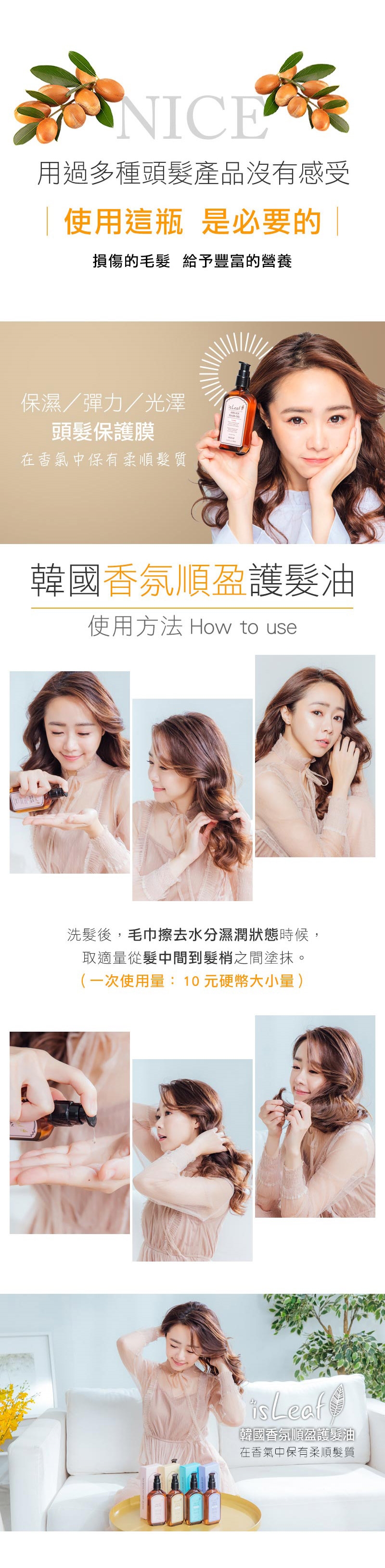商品詳細介紹 使用方法說明 ◎洗完頭髮後,先用毛巾擦拭,在半乾的情況下,取適量(約10元硬幣大小量) 從髮中間到髮梢之間做塗抹!◎平常也可以做使用! 可以搭配離子夾or捲髮器做使用! 注意事項 經拆封後不予退貨