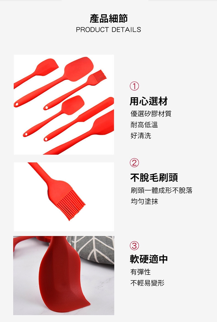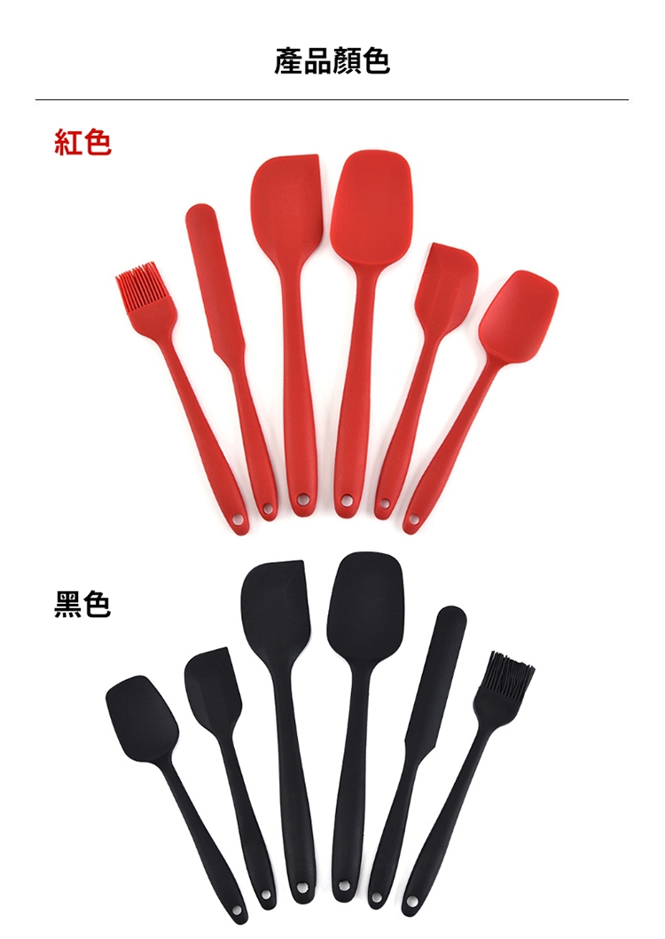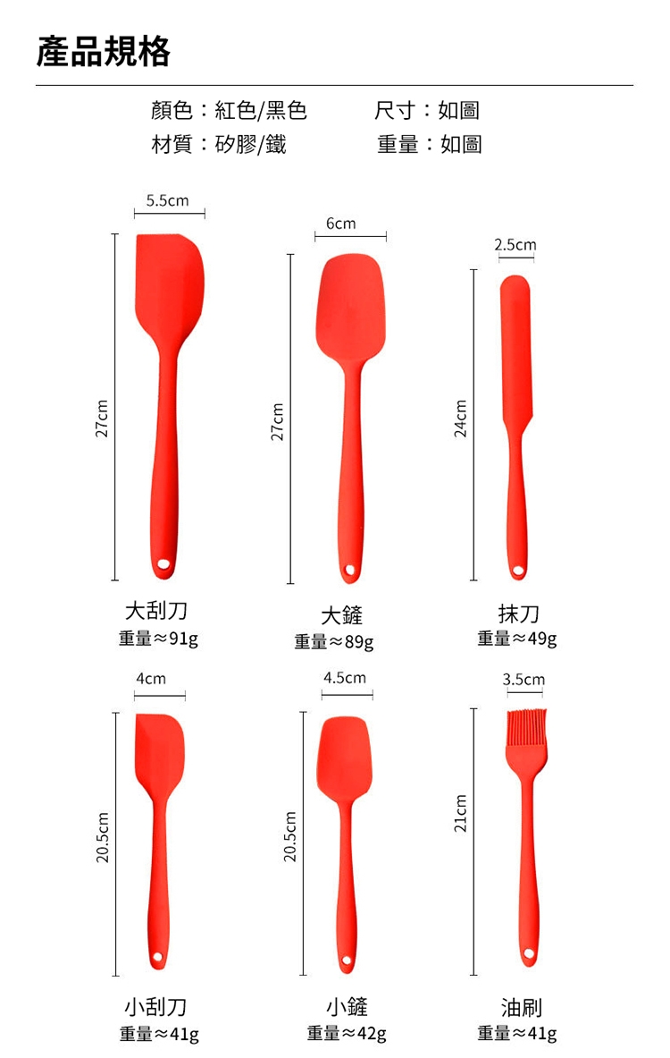 商品詳細介紹 黑紅矽膠烘焙刮刀抹刀六件組六件組合一應俱全,一組搞定烘焙大小事! 🍮大刮刀/小刮刀/大鏟/小鏟/抹刀/油刷:六件組🥞矽膠包覆鐵製內芯,好握不變型🍩刮刀前頭軟硬適中,全角度刮淨麵糊奶油不浪費🍪矽膠材質,耐高溫耐低溫,不易變型🍰矽膠材質不傷鍋碗瓢盆,免去器具刮傷🥧尾部掛孔設計,收納輕鬆隨取隨用矽膠材質好清洗好保養 使用方法說明 無 注意事項 無