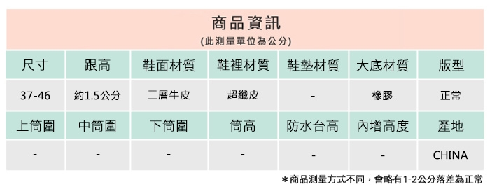 2.鞋類商品依功能及用途之不同,鞋底各有其止滑係數之個別不同,使用鞋類商品請用於正常平坦之路面,非雨鞋或雨靴類商品,請避免穿著於下雨濕滑路面上行走。