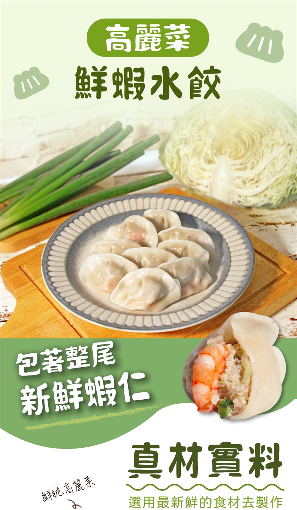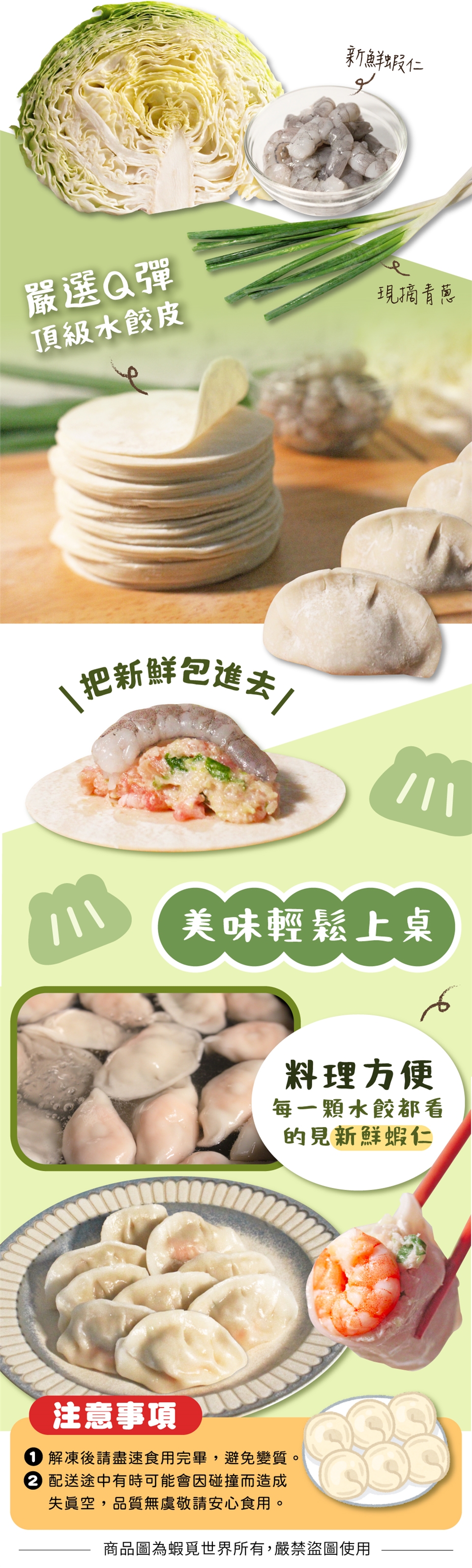 食用方法:水滾加少許鹽巴後下水餃,持續攪拌至再水滾後約6分鐘,至水餃全浮起後撈起水餃再關火