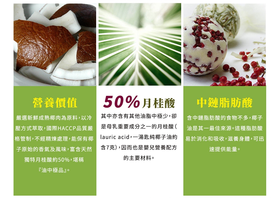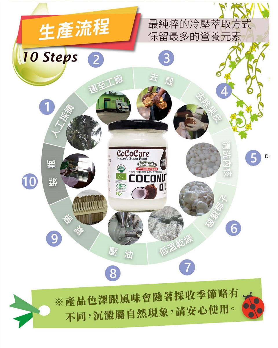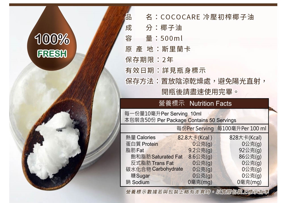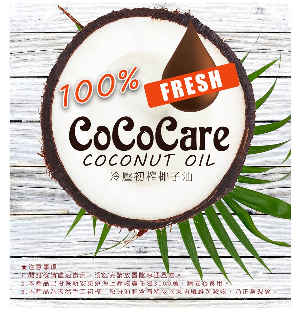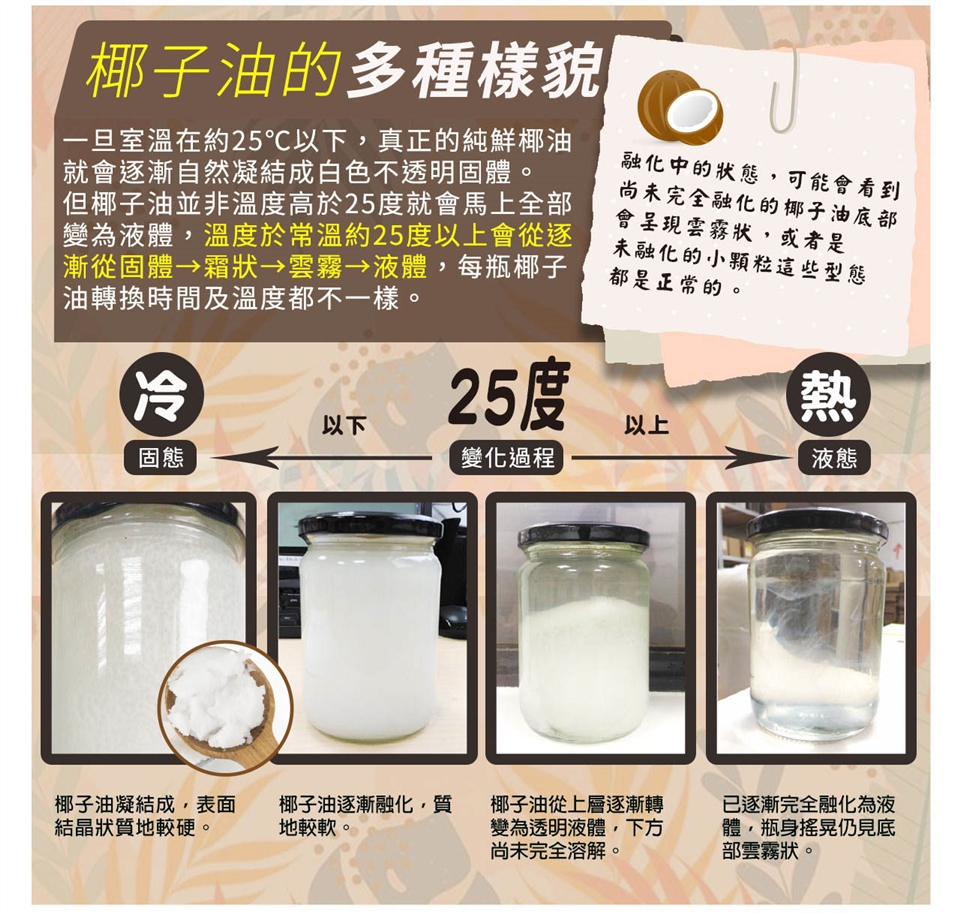 2. 椰子油於室溫約25度以下會有凝結的現象,此為正常現象請安心食用。