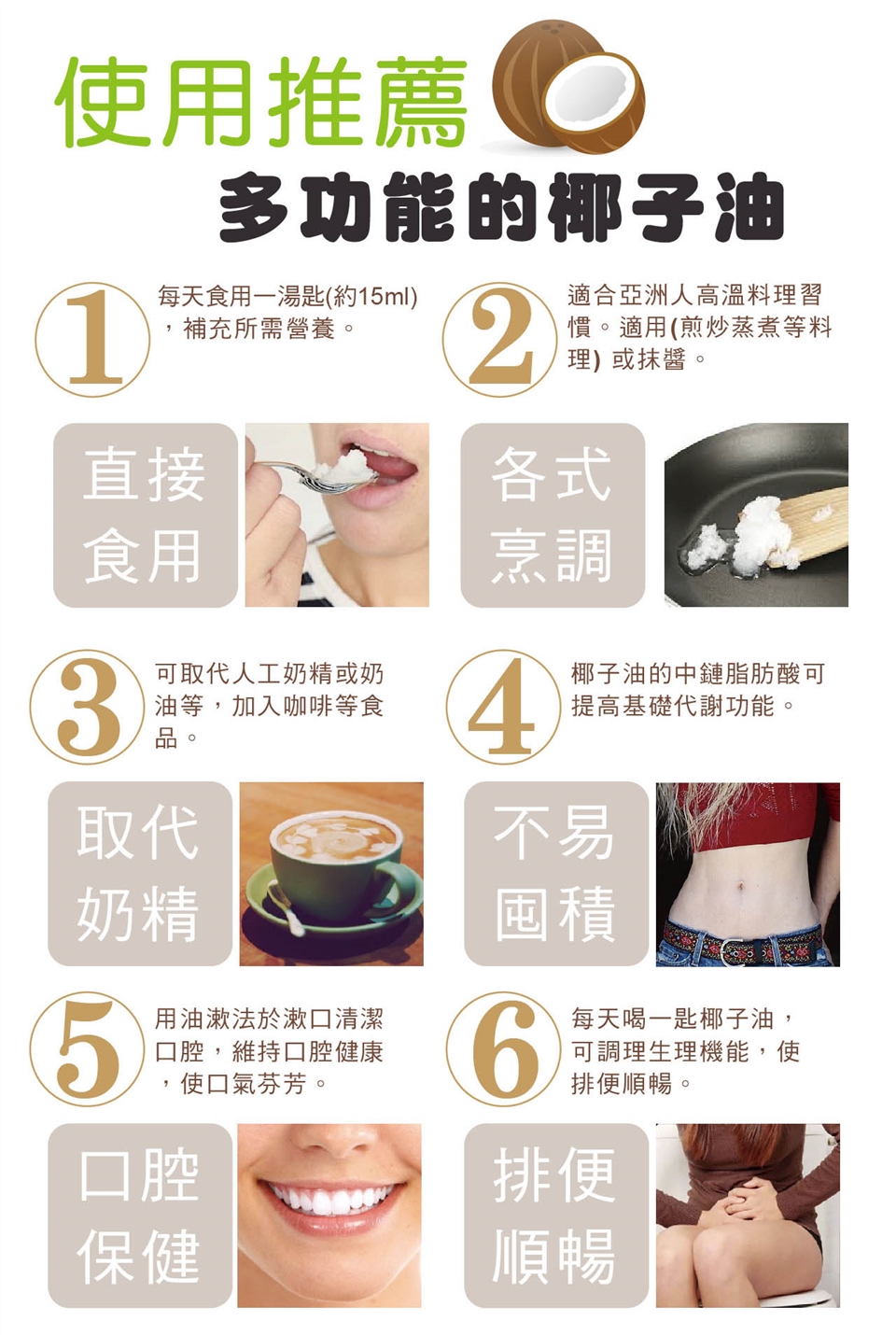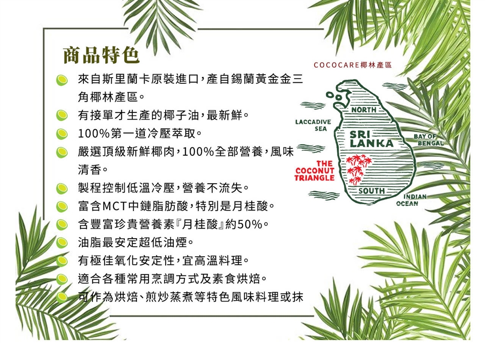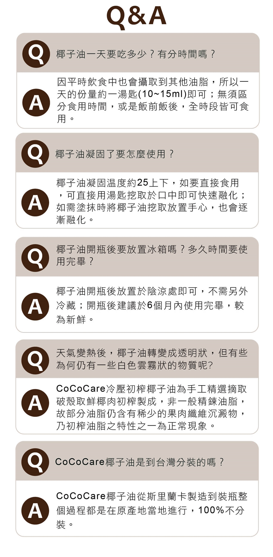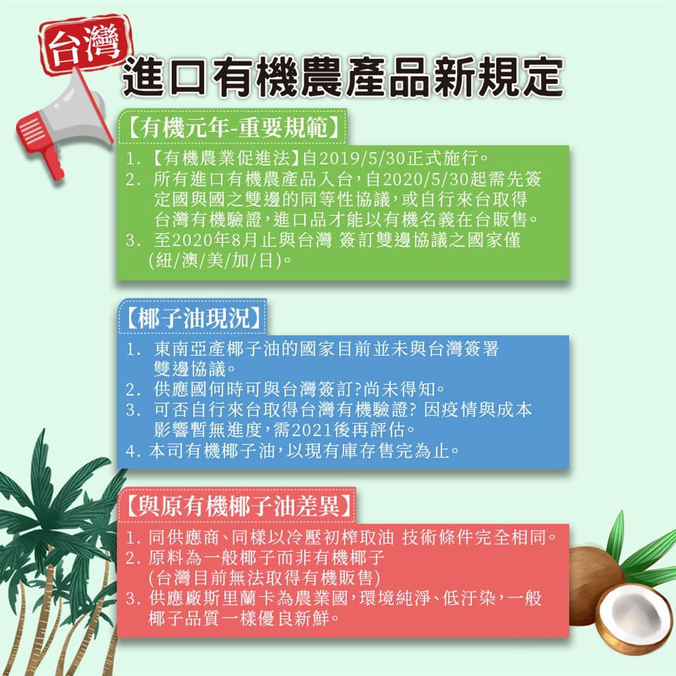 2. 椰子油於室溫約25度以下會有凝結的現象,此為正常現象請安心食用。