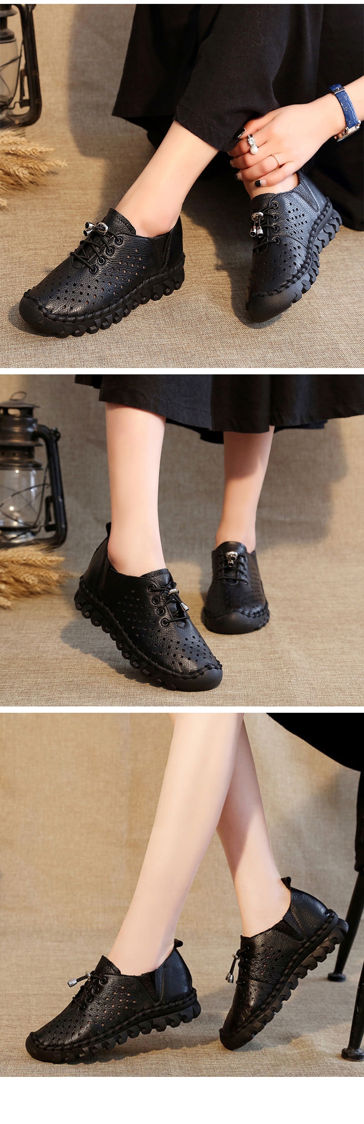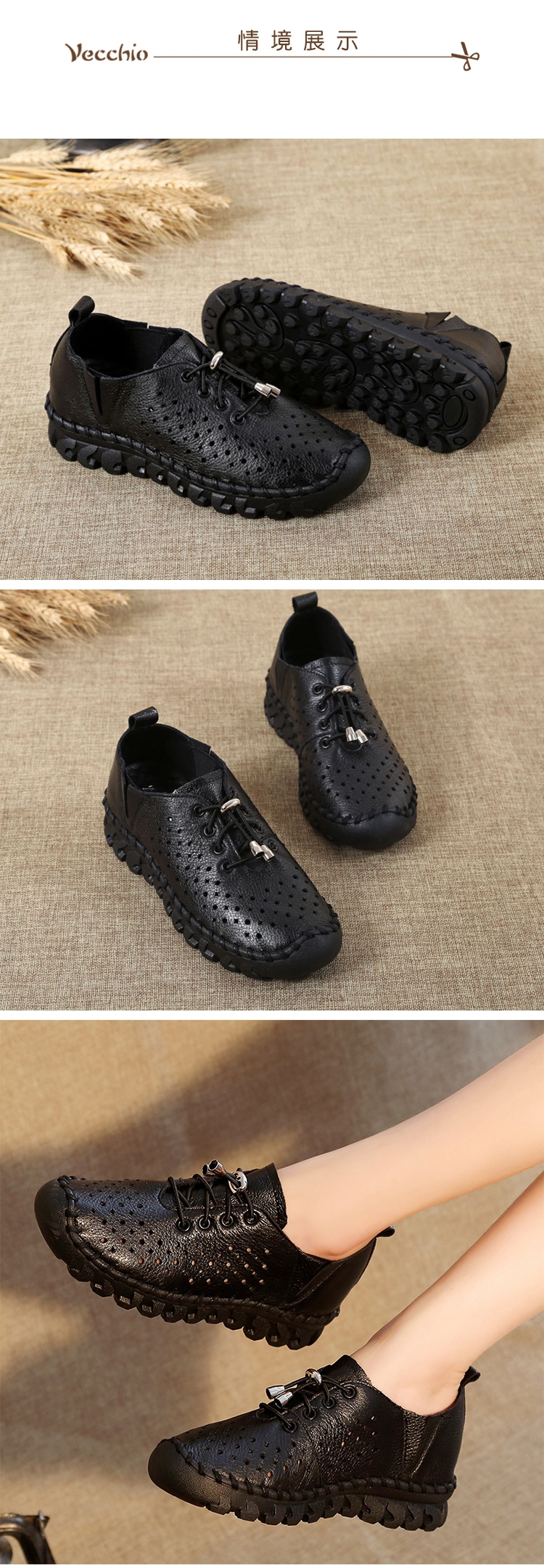 【Vecchio】全真皮頭層牛皮手工縫線沖孔縷空彈力抽繩繫帶厚底休閒鞋 ( 黑 )