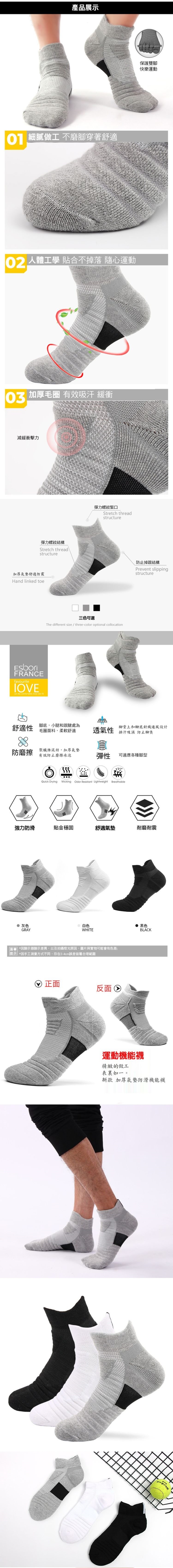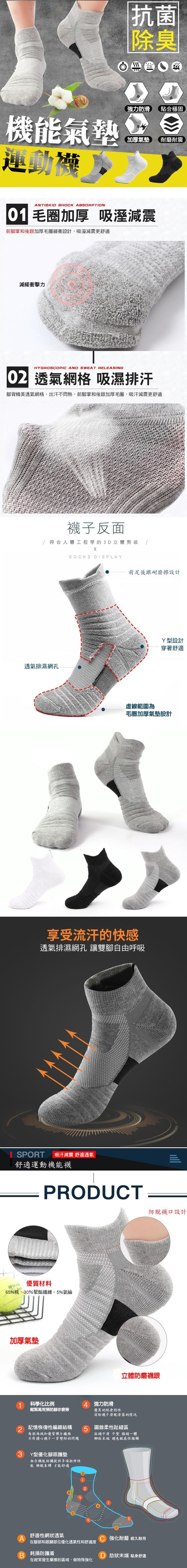 抗菌除臭機能氣墊運動襪,新升級加厚氣墊襪底 更舒適減震,親膚透氣的材質,彈力吸汗,保持足部乾爽舒適不悶熱,柔軟觸感,搭配舒適毛金底材質,2cm厚度吸震減壓,並添加竹炭包紗,運動休閒都適穿,三色時尚色系
