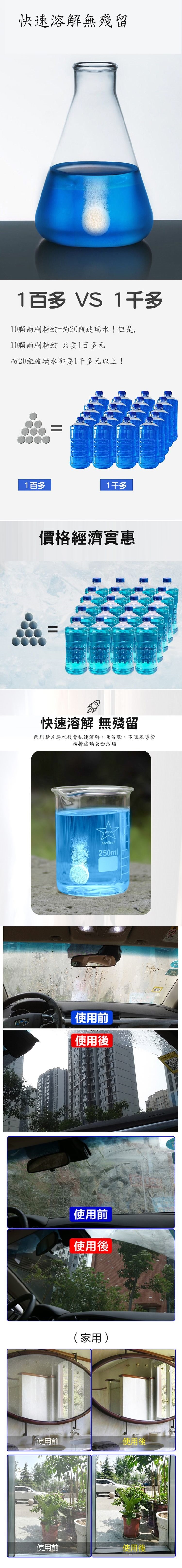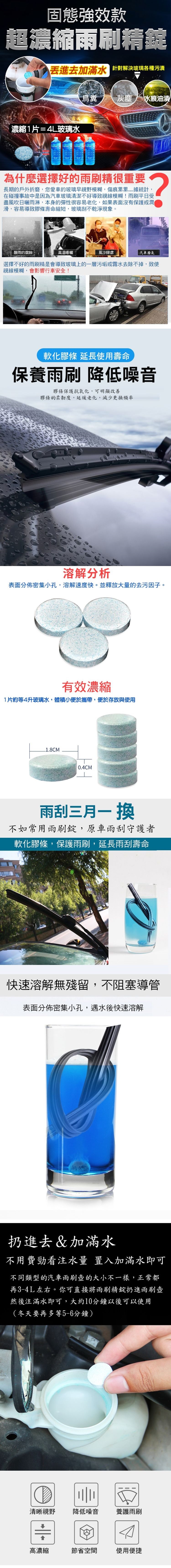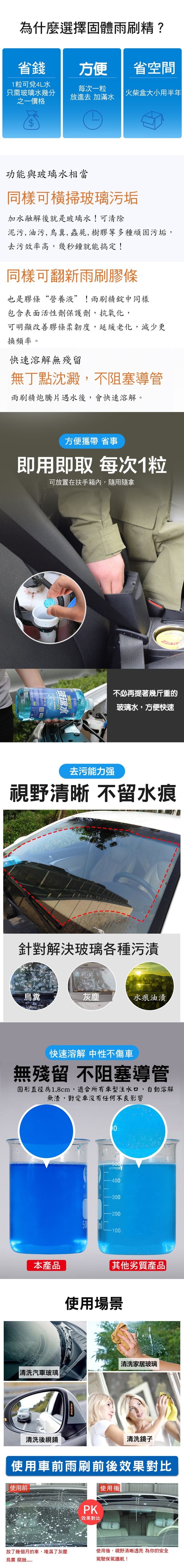 固態強效款超濃縮雨刷精錠,將雨刷精錠直接投入雨刷桶,即可變成4000ml玻璃清潔劑!新升級為 4g強效款 含獨特養護玻璃配方,具高效清潔力,可迅速清除玻璃油汙~瞬間消泡功效,不擋行車視線,使用更安心~還能有效潤滑雨刷,增長雨刷壽命唷!除了給愛車使用,居家玻璃清潔也OK喔!