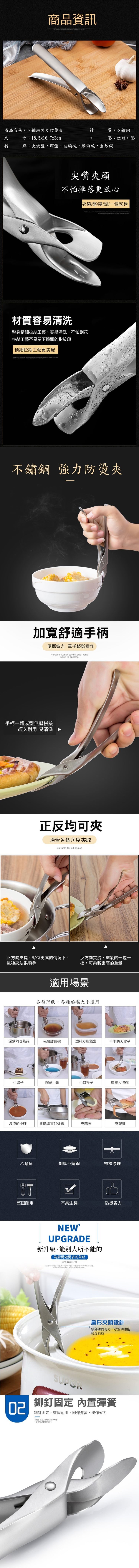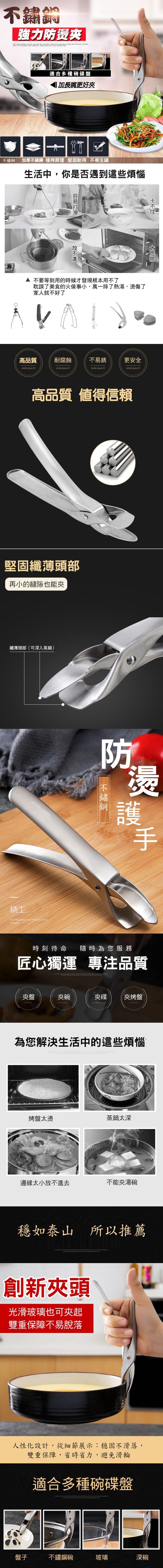 不鏽鋼強力防燙夾,新拉絲工藝不鏽鋼,一體成形,堅固耐用,採以力學原理,無論容器大小、材質,一夾就緊,再窄的縫隙也能輕鬆夾起,讓您再也不怕從鍋裡或微波爐裡拿取滾燙的碗盤時燙到手,是您廚房的便利好幫手!