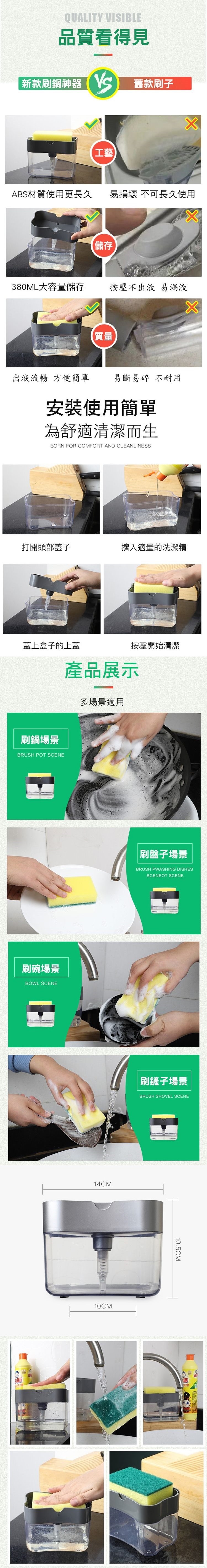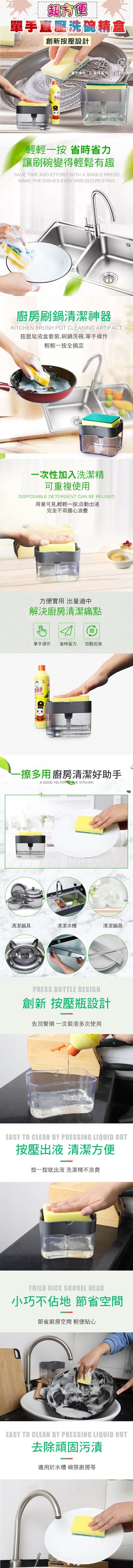 超方便單手直壓洗碗精盒,創新按壓瓶設計,告別以往洗碗精滴的瓶身都是,既浪費又噁心,用菜瓜布按壓後即出液,沾上洗碗精便可開始洗碗,省時省力節省用量,超級方便,可放置廚房、浴室、洗手台等地方,不可或缺的多功能好幫手。