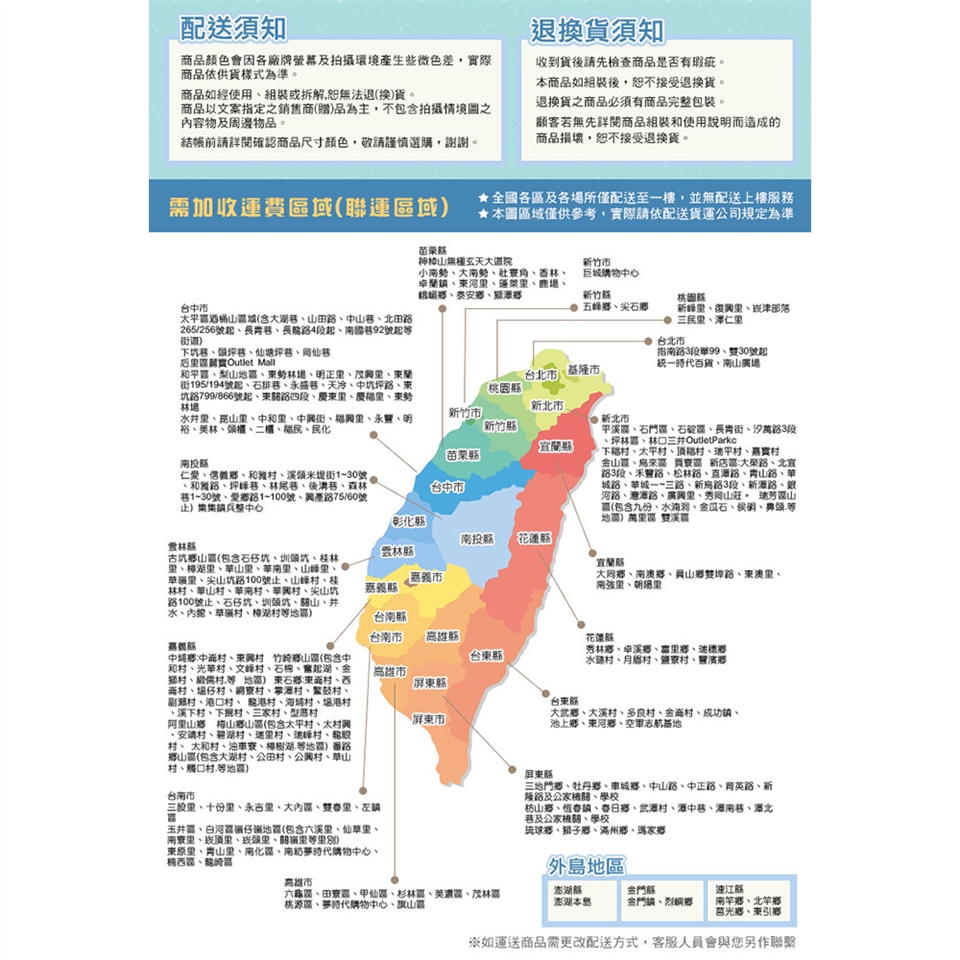 如物流單位判定需另加運費或暫無配送地區,業務會先以電話通知,取得同意後再加收運費;本司保有配送權利。