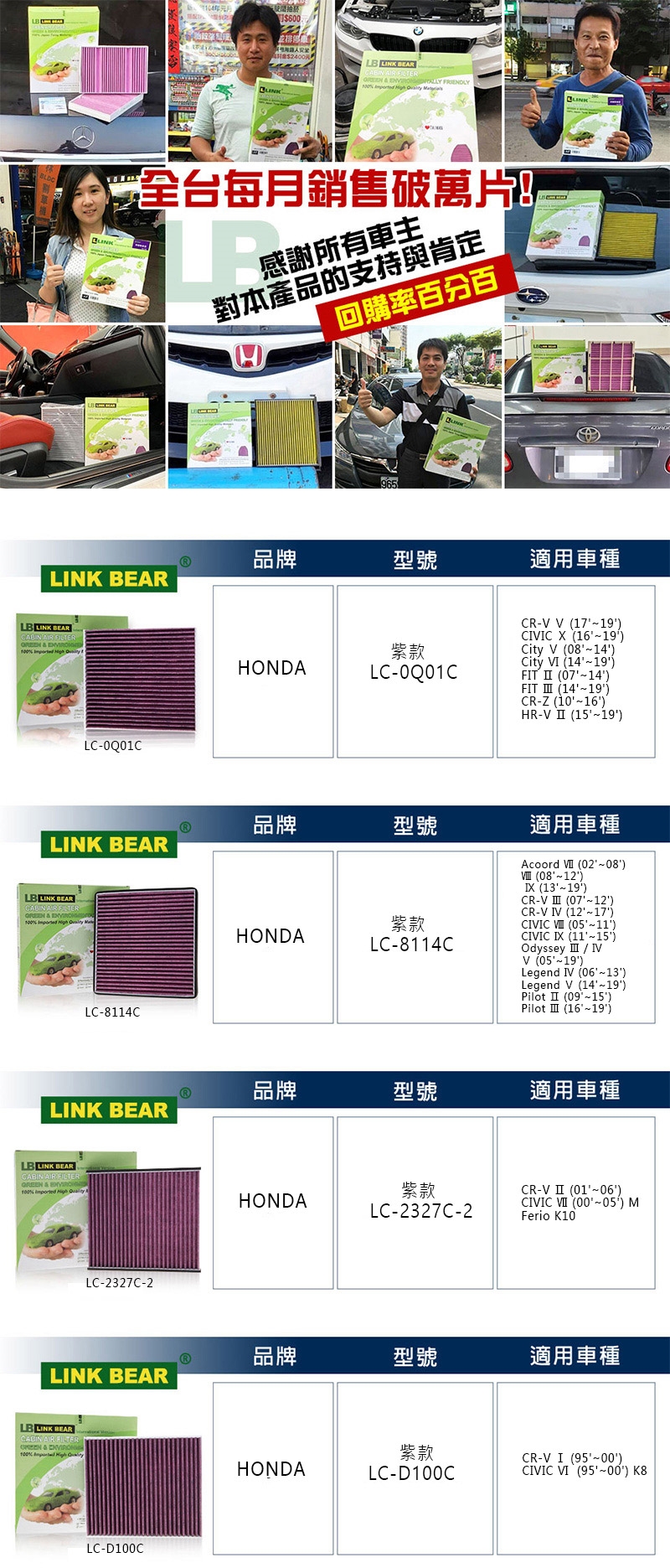 品名:【LINK BEAR】汽車三層冷氣靜電濾網 (紫) 適用 HONDA LC-D100C/LC-0Q01C