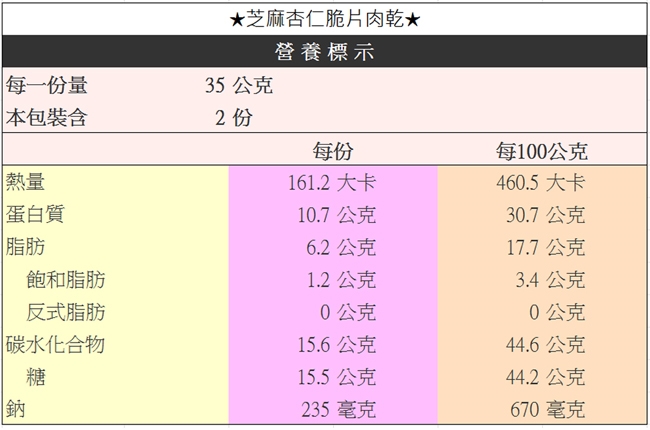 內容物:豬肉、杏仁片、糖、黑胡椒粒、鹽、大豆水解蛋白、麥芽糊精、棕櫚油、葵花籽油、中鏈三酸甘油酯、葡萄糖、乳糖
