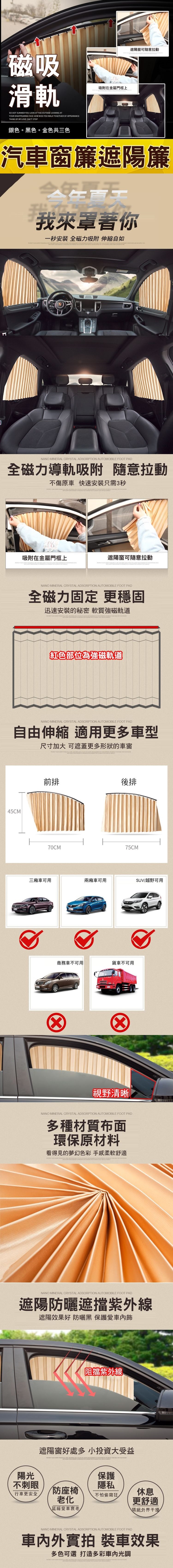 1.適用於大部分車型,磁吸軌道可根據窗框大小和喜好自由裁剪,裁剪後請記得將兩側卡扣軌道帽裝回,避免窗簾掛勾脫落。(注意:本產品一經裁剪後無法辦理退換貨,謝謝。)