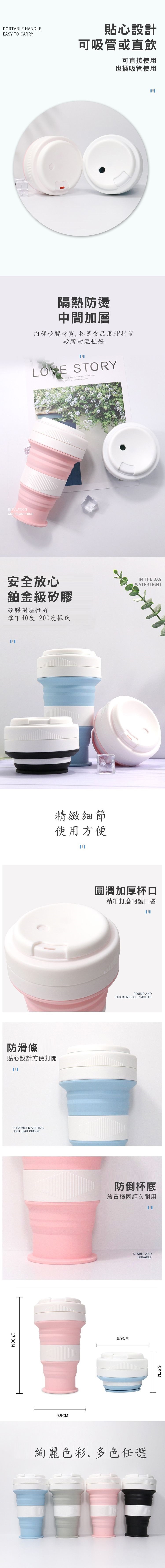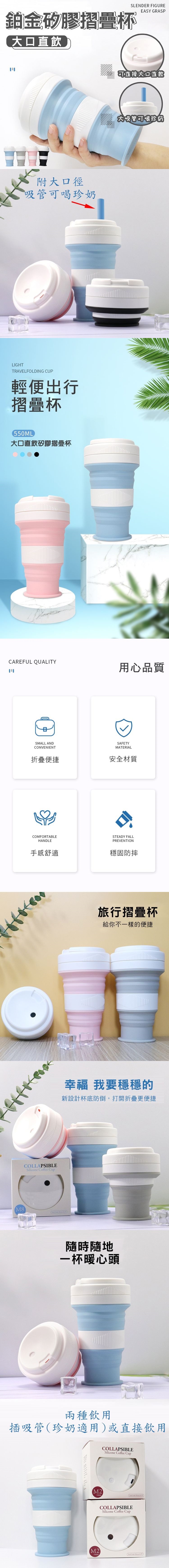 夏天到了要幹麻? 當然是 大口直飲 才夠爽快!大口直飲鉑金矽膠摺疊杯,直飲或插吸管(大口徑的珍奶吸管也適用)2種飲用方式,出差、旅遊,隨身帶保溫瓶實在太不方便啦!這款百變矽膠折疊杯,滿足您的所有飲水需求,入住酒店再也不用擔心杯子不乾淨!5秒折疊,口袋也能放的下,不佔空間,小巧便攜;食具用矽膠,健康安心,耐高溫,不怕摔不變形!是你的隨身好朋友~