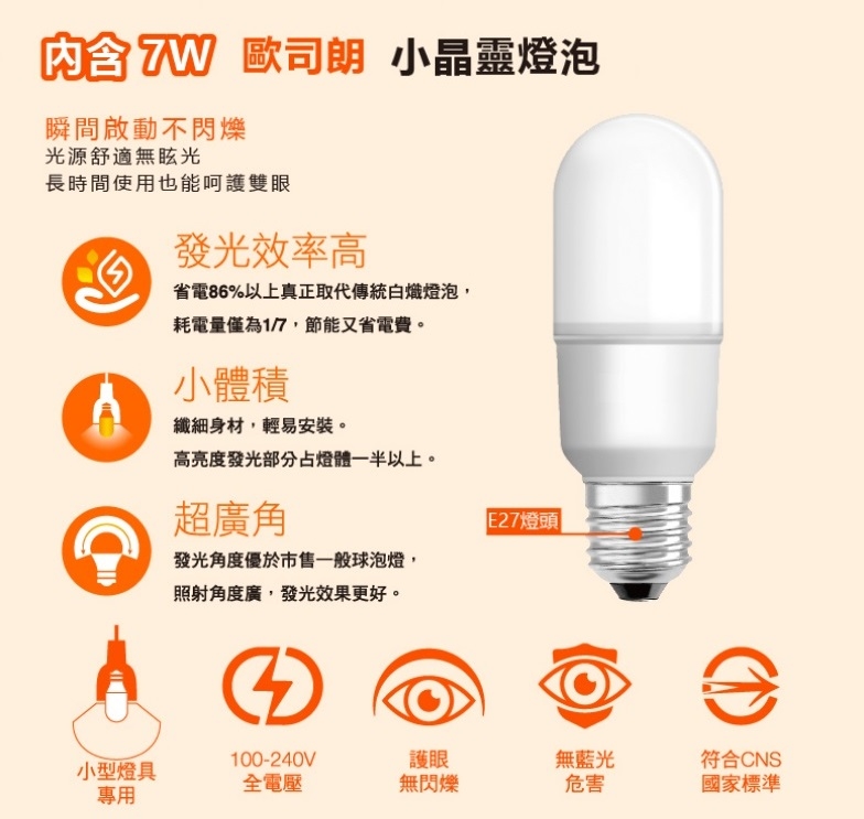 燈泡:內附OSRAM LED小晶靈燈泡7W*1