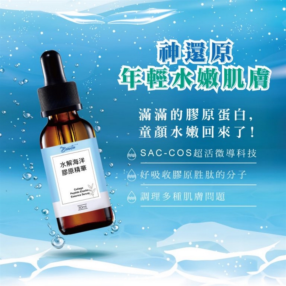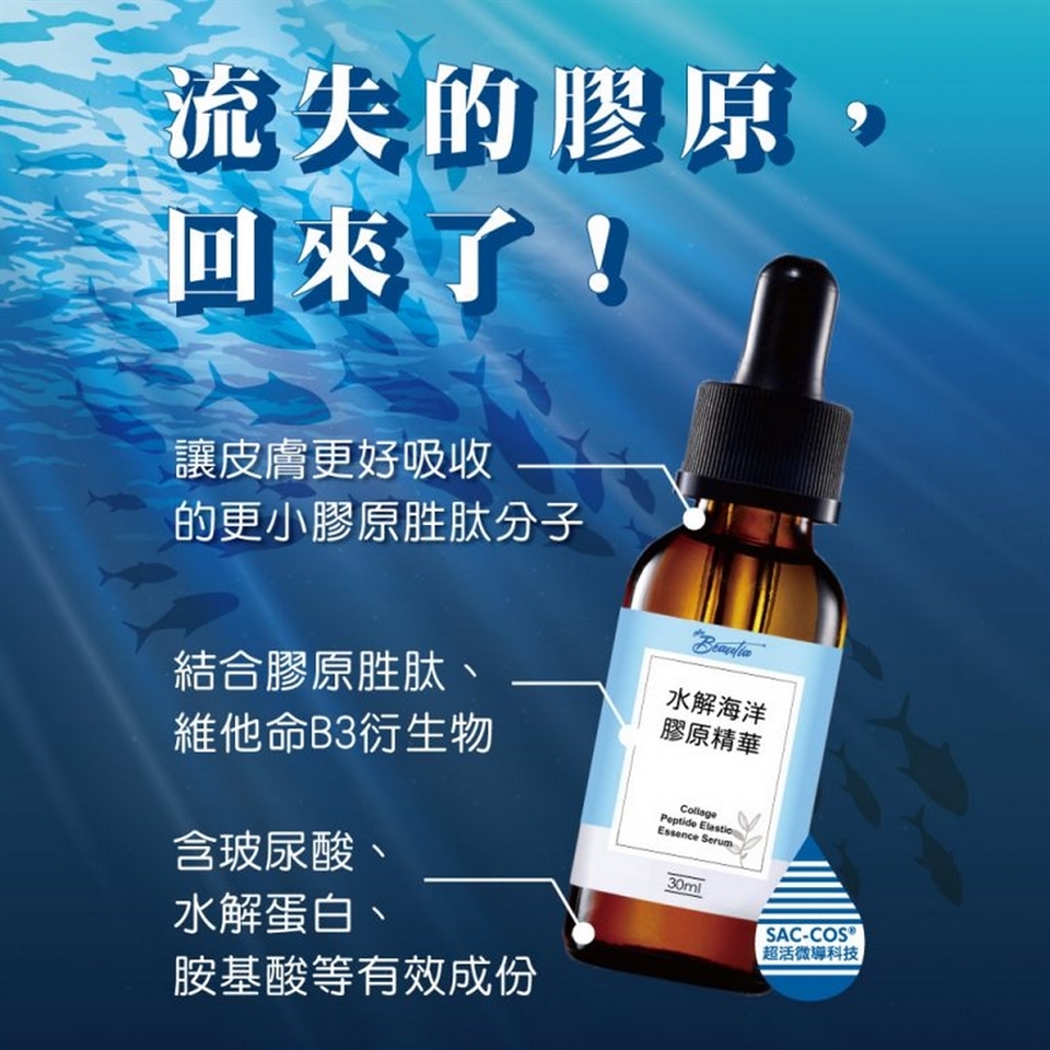 一般膠原蛋白的分子太大,以致無法通過皮膚被吸收利用,而膠原胜肽的分子比傳統膠原蛋白來得更小,利用SAC-COS超活微導科技,能夠讓皮膚更好吸收。倍立雅水解海洋膠原原液同時結合膠原胜肽、維他命B3衍生物、玻尿酸、水解蛋白、胺基酸等有效成份,能夠顯著改善皺紋、暗沉、缺水等多種肌膚問題。