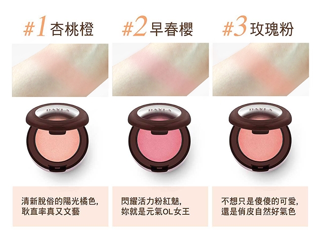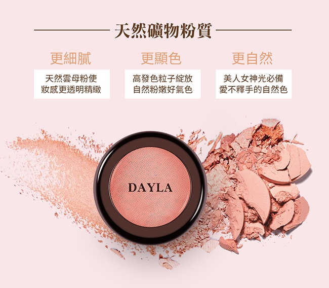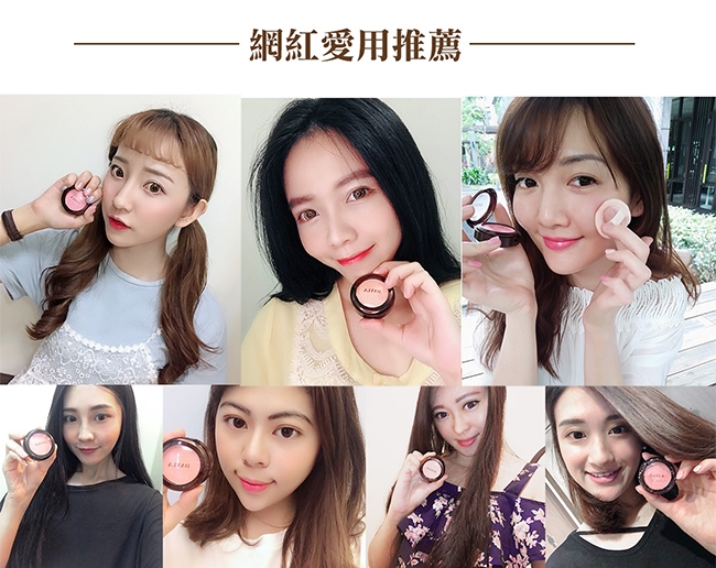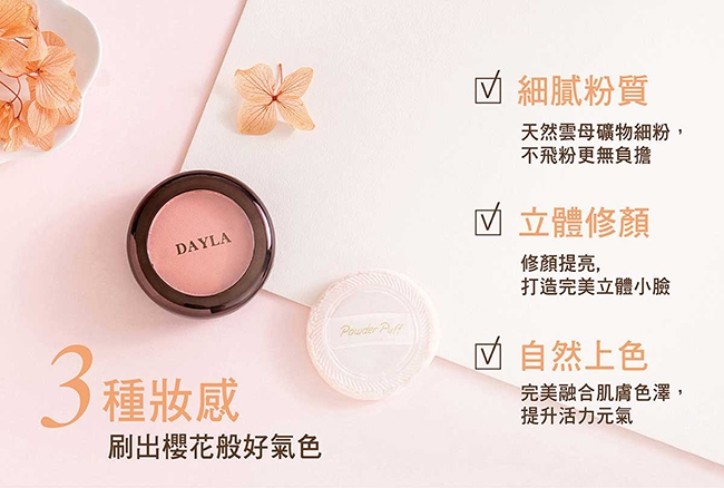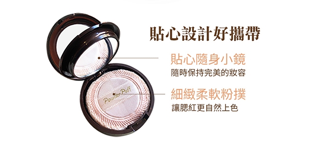 使用內附粉撲沾取適量腮紅,輕拍於微笑肌上。也可使用腮紅刷