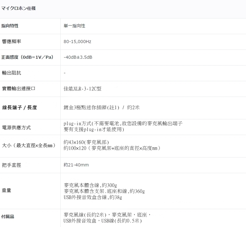 不過,並不支援XLR輸入端子及(轉接後的)6.5mm輸入端子,因本款麥克風採用plug in供電,就算接上您現有的音響影音設備(註2)也無法使用。