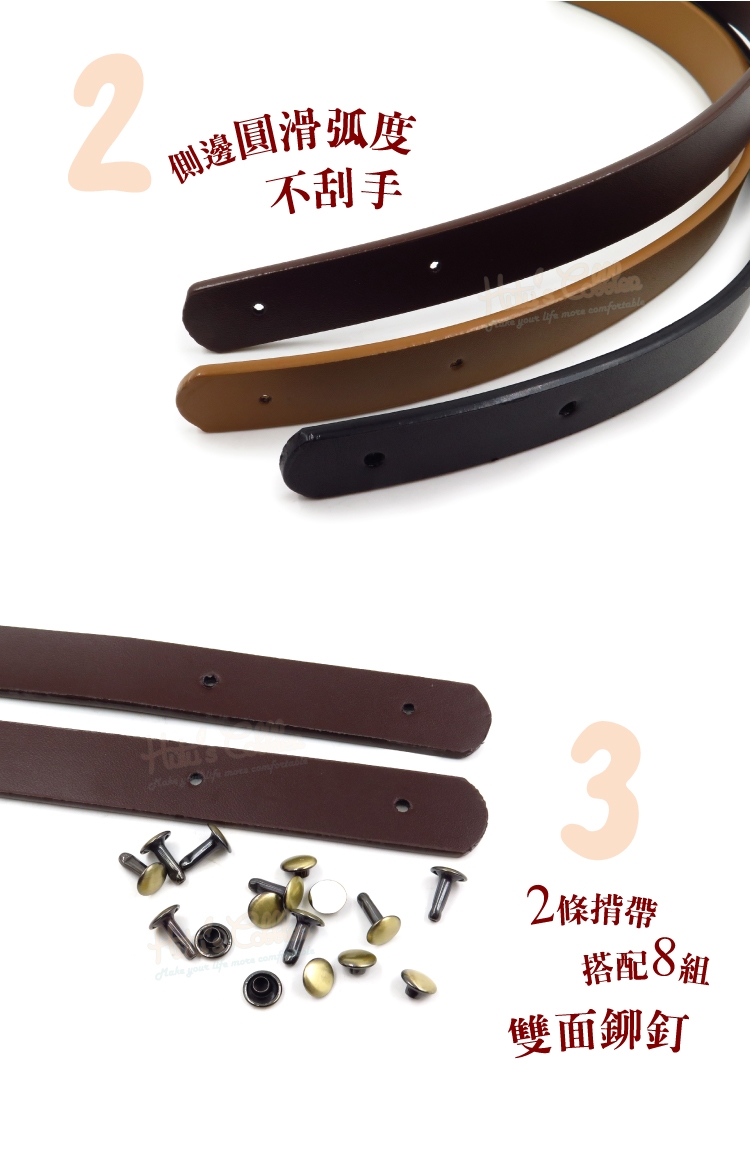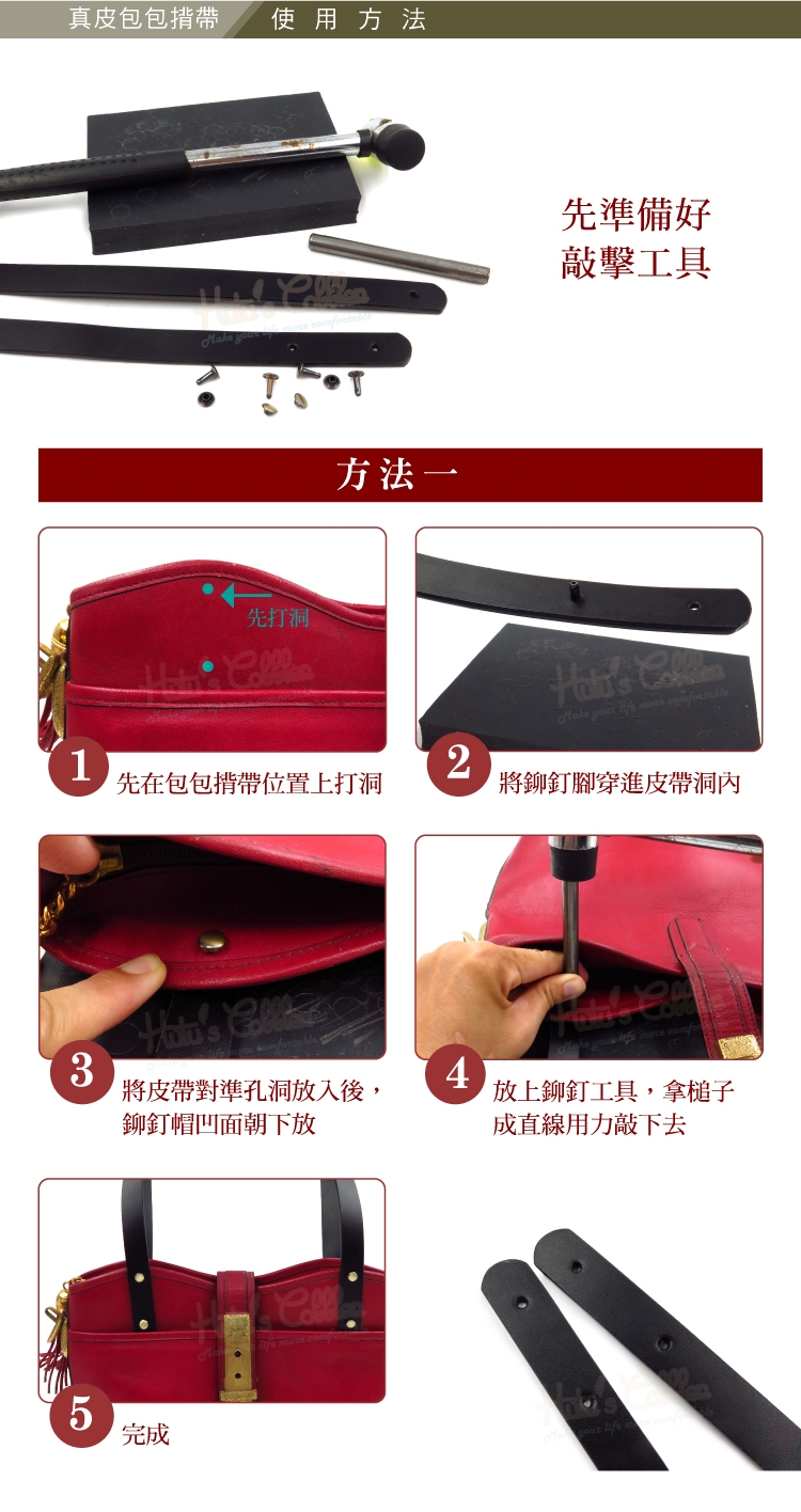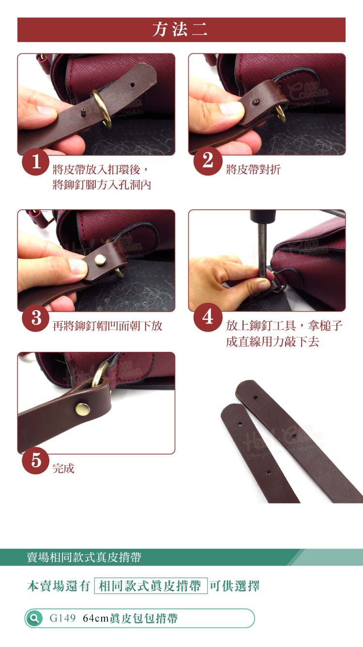 1.將皮帶放入扣環後,將鉚釘腳方入孔洞內