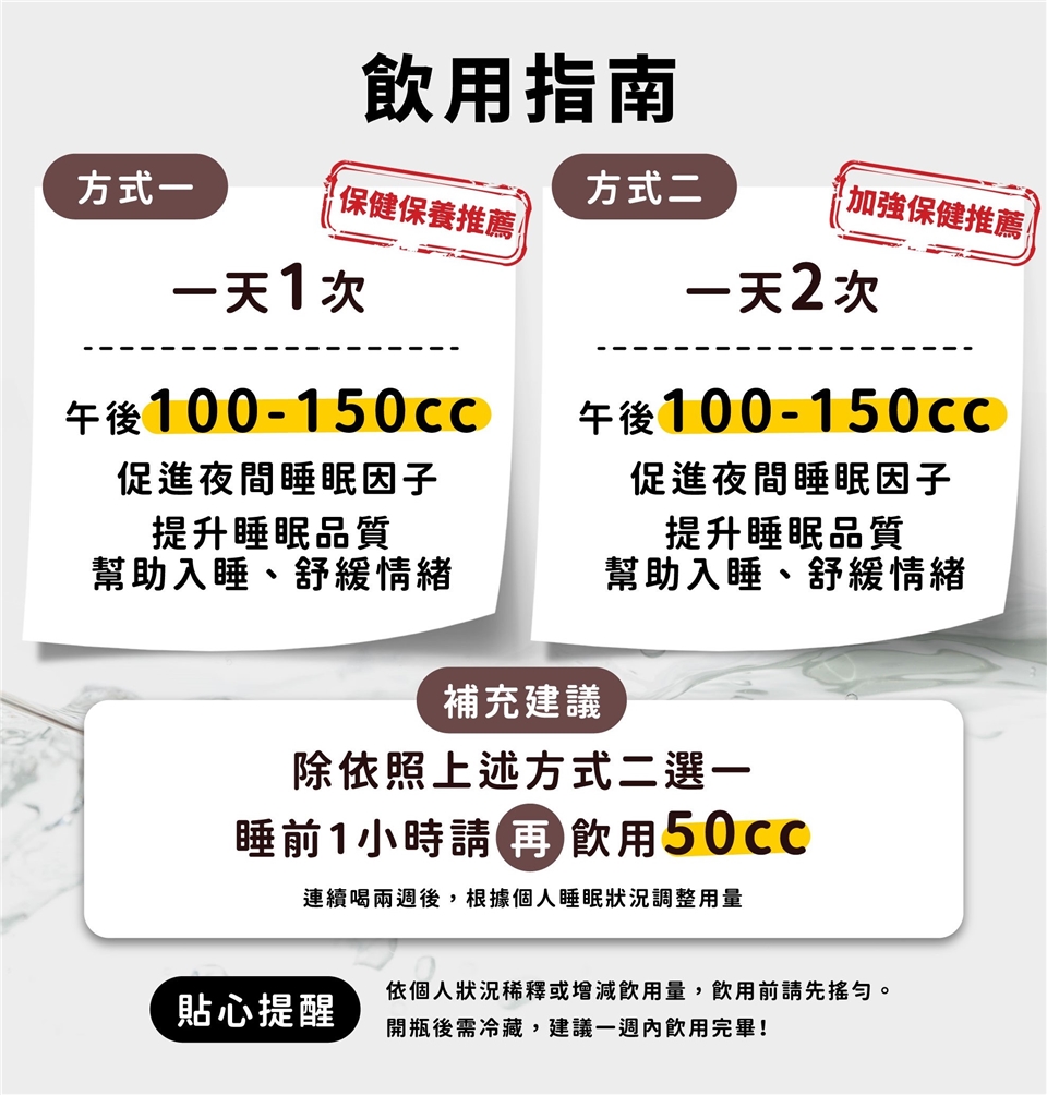 食用方法:建議每日200-250毫升,依個人狀況增減或稀釋。