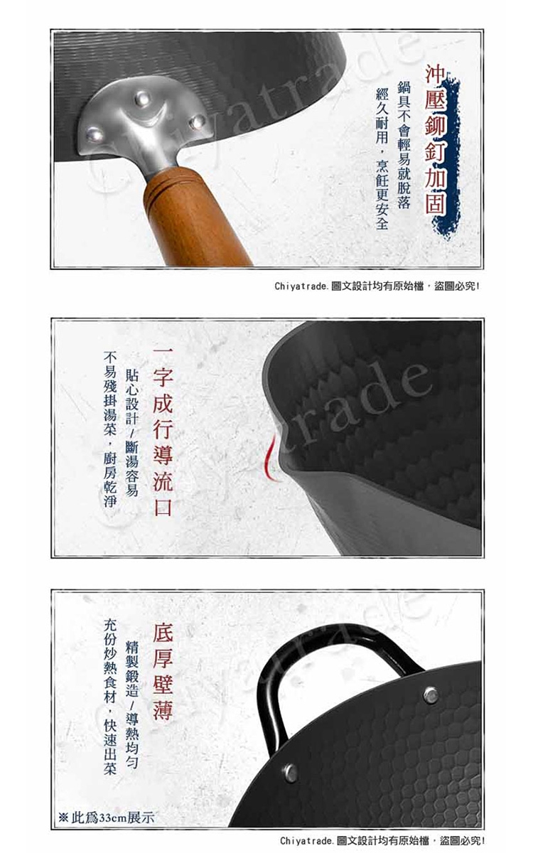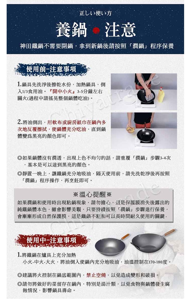-如果潤鍋和使用時出現粘鍋現象,請勿擔心,這是保護膜消失後露出的純鐵鍋體本色,雖會影響美觀,