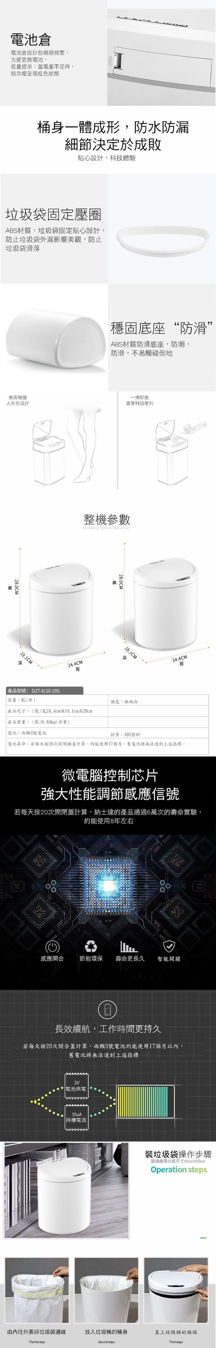 紅外線感應式垃圾桶,新升級 DZT-8-29S 8公升款,不大不小剛剛好的尺寸, 給你更智慧的居家生活環境~想丟垃圾時手一伸,蓋子便自動打開,不會碰到髒污避免細菌交叉感染且不易飄散異味,不鏽鋼材質耐髒汙容易清潔,輕巧體積適用各種空間,耗電量低節能環保,金屬質感超時尚!