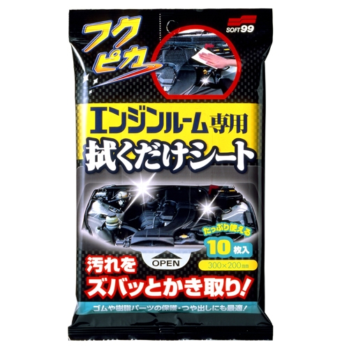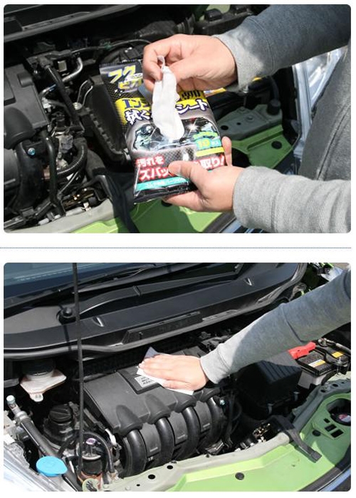 特色:只需擦拭即可清除污垢的特殊濕巾。徹底吸去引擎室機箱上的灰塵和油污。不會像噴射型四處飛濺,只需從袋中取出擦拭。隨時隨地都可使用。樹脂零件、橡膠製軟管、硬管使用後,可在表面形成保護膜。無需用水,以及擔心電子零件短路和斷裂等。也不用進行煩人的防水措施。