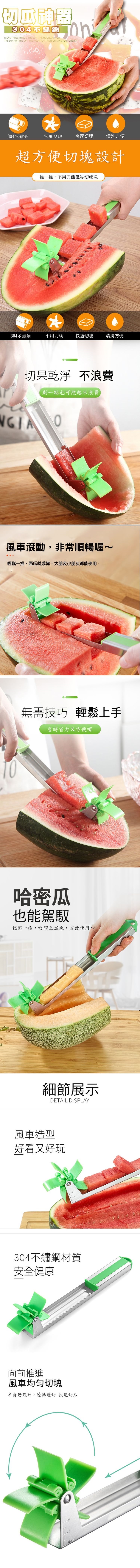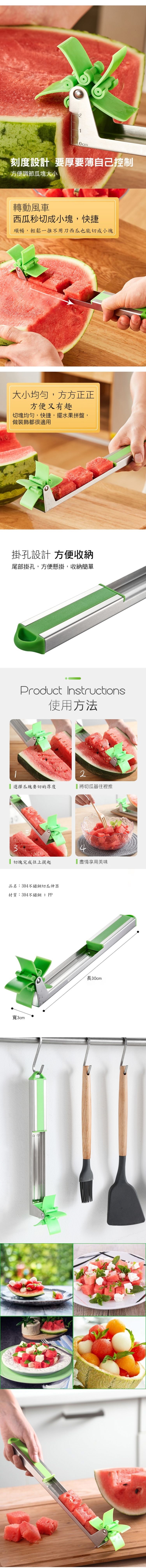 全新升級 304不鏽鋼切瓜神器,讓你吃西瓜不必再用水果刀!取肉、挖瓤、切塊超快速,厚度大小還可自行調整,要切薄切厚自己決定,整齊切分,一塊塊取出,好看又方便!尾部有掛孔收納方便,此款為304不鏽鋼材質非舊款的 201 材質喔,追求品質~讓您使用更放心!