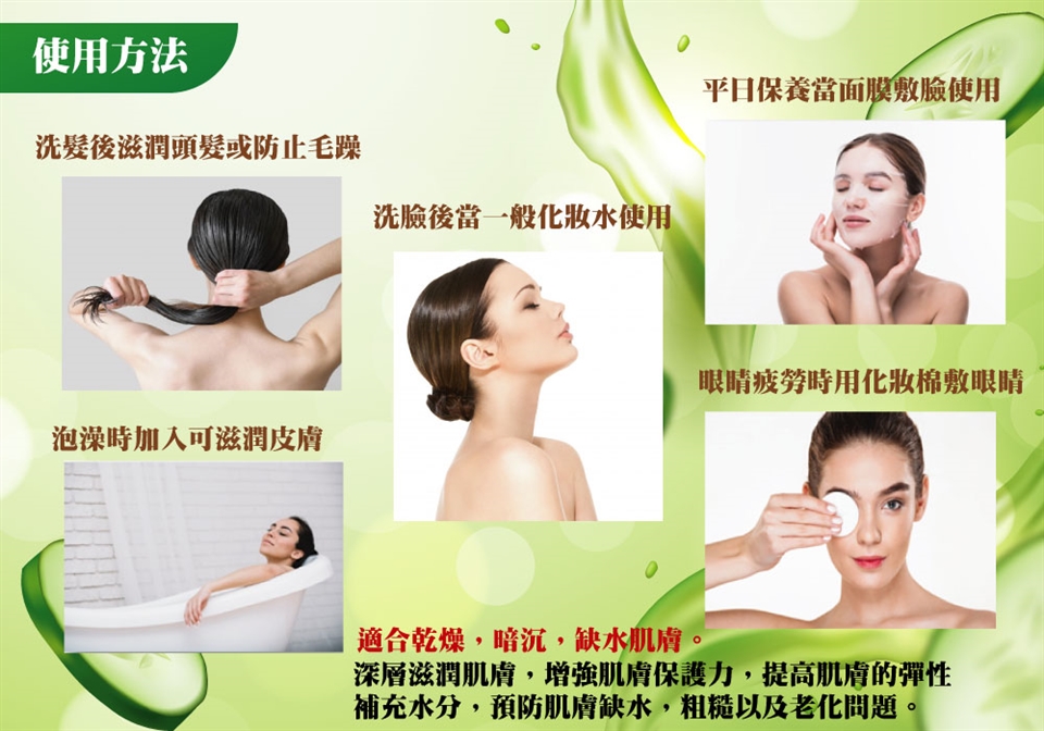 洗臉後可當化妝水使用,直接輕拍臉部或敷臉,全身均可使用。
