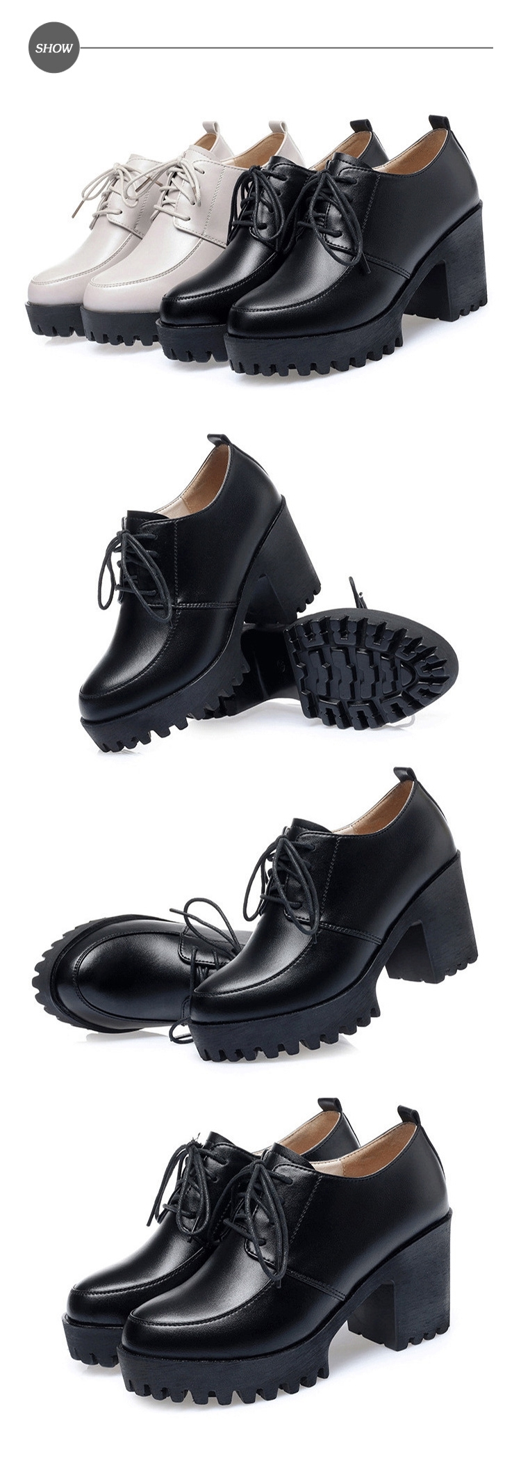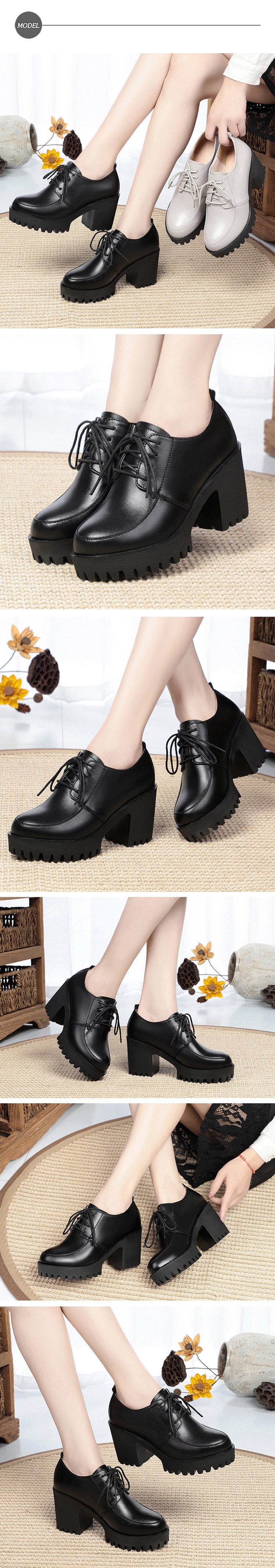 【MOM】真皮細緻牛皮復古版型厚底防水台深口綁帶粗跟休閒鞋 ( 黑 )